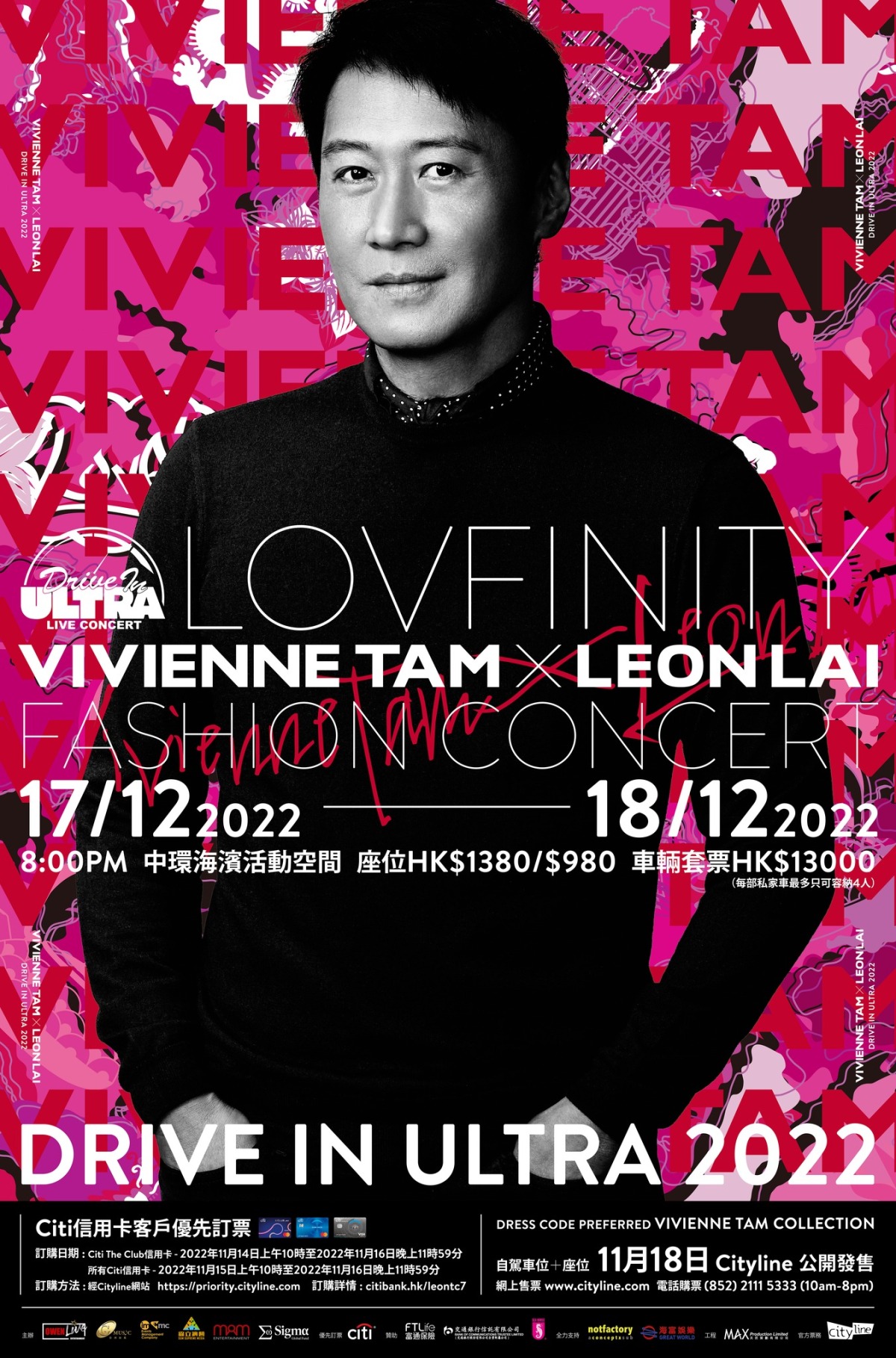 主辦單位於社交平台公布,黎明將於12月17至18日假中環海濱舉行兩場《Drive In Ultra: LOVFINITY Vivienne Tam x Leon Lai Fashion Concert》戶外演唱會,結合名師Vivienne Tam的時裝和音樂會。票價分別為座位1380元/980元,車輛套票13000元(每部私家車最多只可容納4人)。門票將於下月14日優先訂購,公開發售日為11月18日。(點此購票)