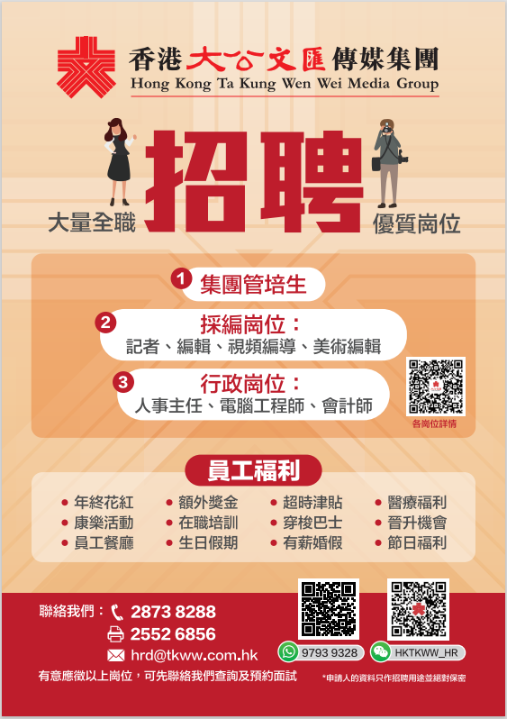 香港大公文匯傳媒集團於本次招聘會提供大量優質職位,除了採編崗位,還有集團管培生,旨在為集團選拔、培養、儲備優秀的後備人才等,為傳媒業栽培新血。在昨日的招聘會上,香港文匯報總編輯吳明、香港大公報總編輯于世俊和香港仔總編輯林映等資深傳媒人亦到場與應聘者交流。