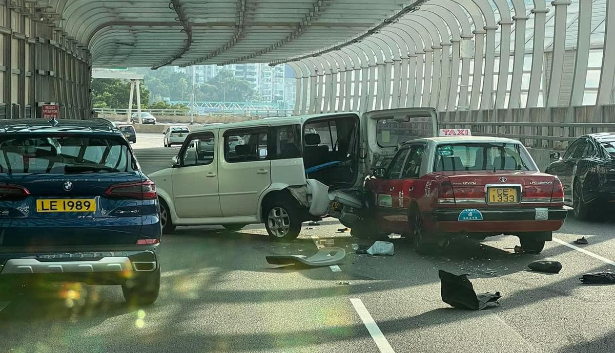 今日(10月30日)下午4時許,東區走廊往銅鑼灣方向近海景大廈發生交通意外,涉及一輛的士及一輛七人車。現場圖片可見,兩輛車均有不同程度損毀,碎片散落一地。