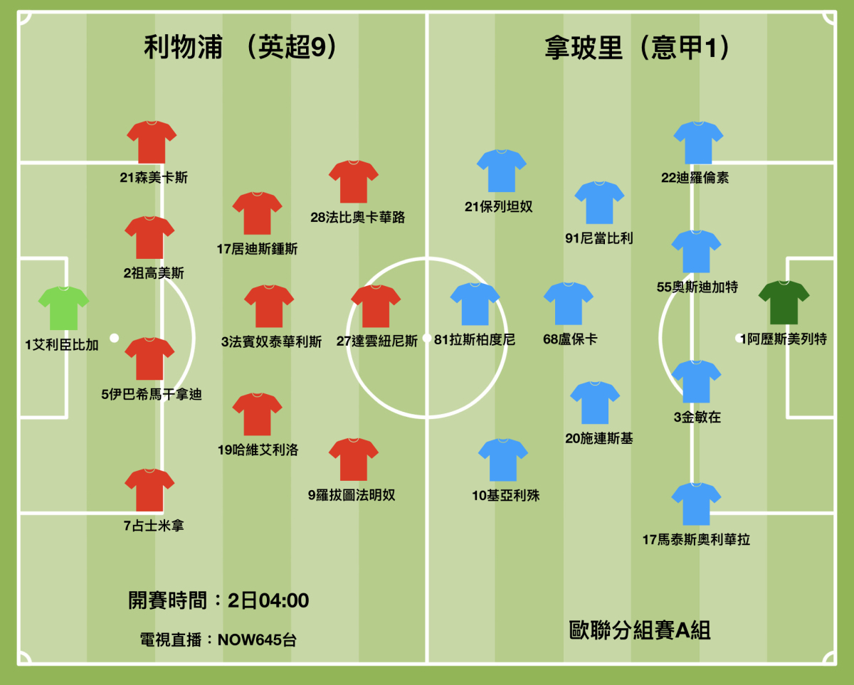 拿玻里與利物浦在歐聯A組均已順利奪得出線資格。利物浦在英超接連爆大冷不敵護級隊伍森林和列斯聯,主帥高洛普希望世界盃決賽周能快點到來,好讓他與不用參加世界盃的球星們藉此喘一口氣,到球賽於12月底重啟時,再在聯賽收復失地,並再於盃賽爭取表現。由於拿玻里正值13連勝強勢,利物浦看來要再吃敗仗。(香港時間2日周三凌晨4時開賽,NOW645台直播)