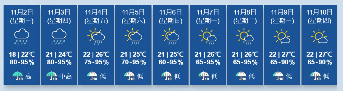 根據天文台未來9日天氣,東北季候風會在本周持續影響華南,而熱帶氣旋「尼格」會在未來一兩日靠近廣東西部沿岸。受「尼格」及東北季候風的共同影響,未來一兩日該區風勢頗大,海有湧浪,間中有狂風驟雨。隨著「尼格」減弱及逐漸遠離廣東沿岸,預料接近周末該區天色好轉,驟雨逐漸減少。此外,位於菲律賓以東海域的熱帶氣旋「榕樹」會逐漸減弱。