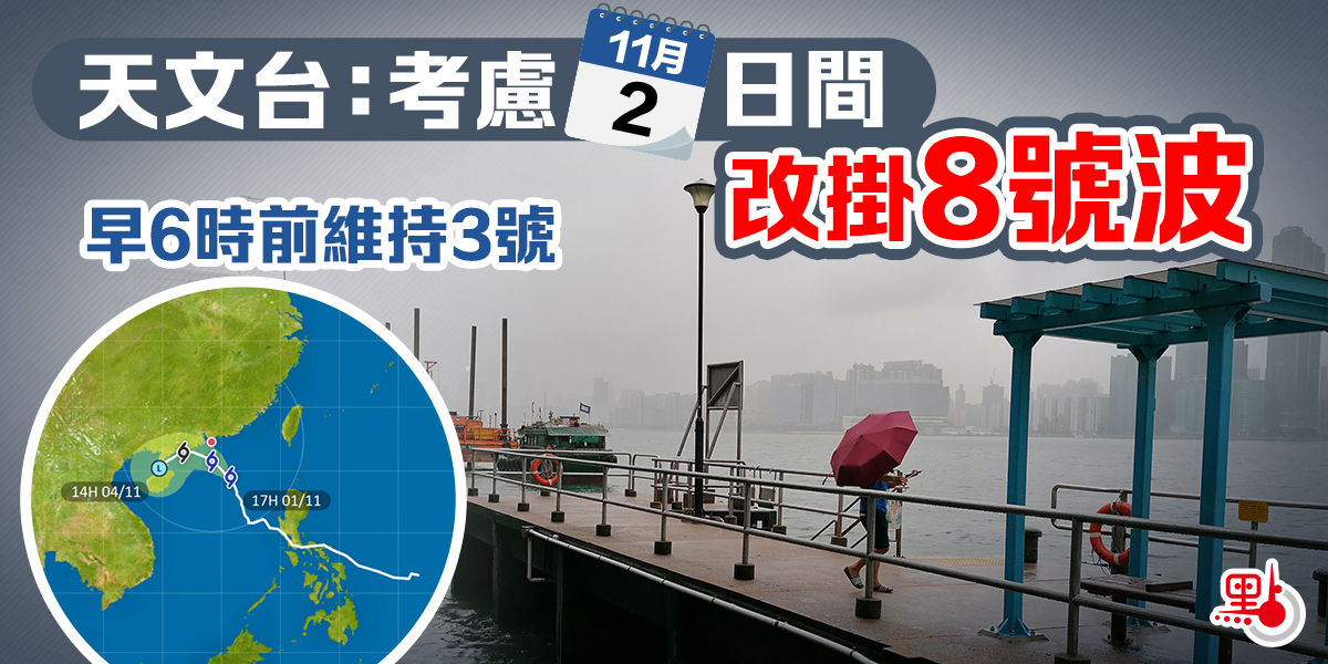 天文台今日(11月1日)下午4時45分表示,三號強風信號會在明早(2日)6時前維持,天文台會考慮明日日間發出八號烈風或暴風信號,但實際時間需視乎本地風力變化。