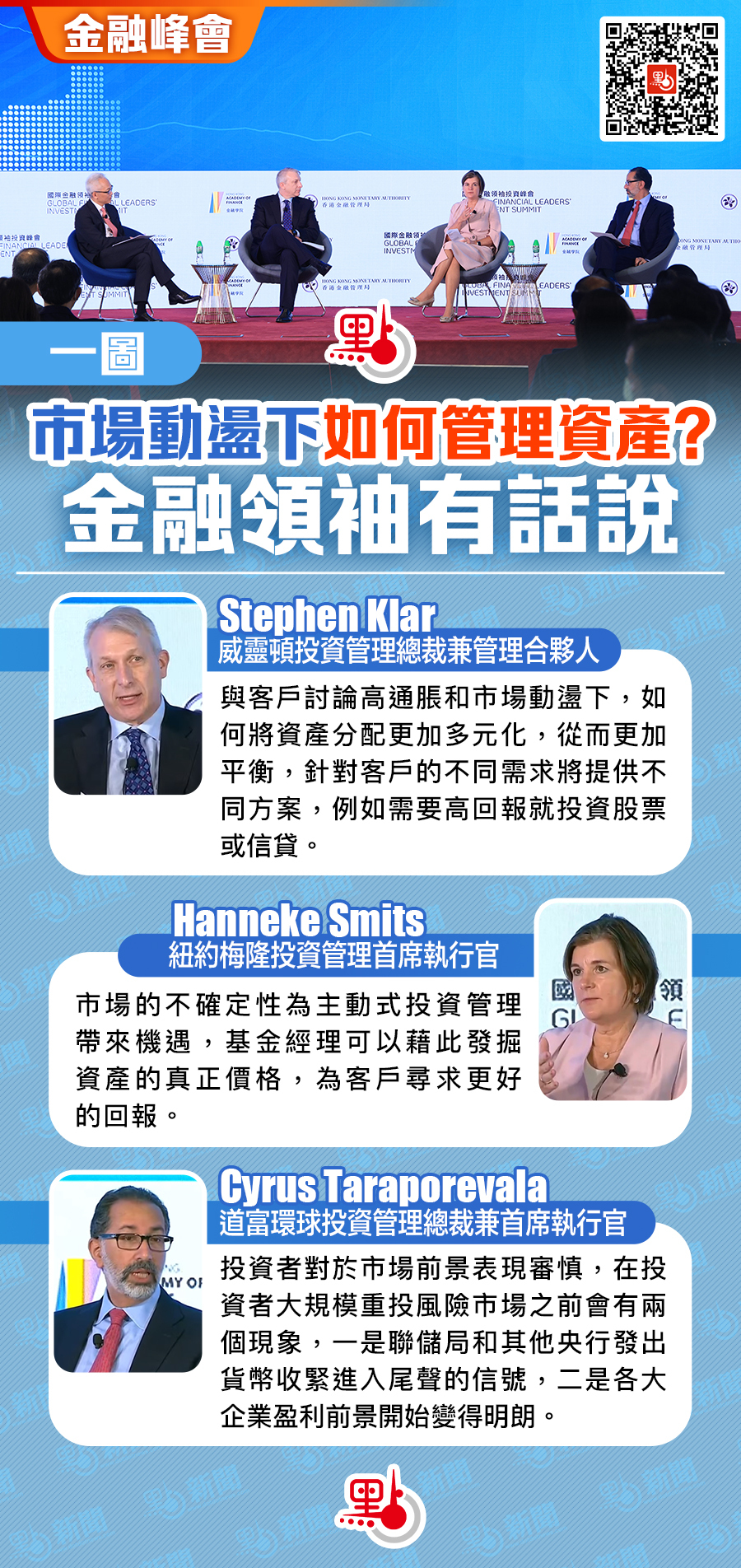 國際金融領袖投資峰會今日(3日)繼續在港舉行,主題是「與國際投資者對話」,第二場專題討論以「在動盪市況如何管理資產」為題,由香港金管局副總裁李達志主持,邀請威靈頓投資管理總裁兼管理合夥人Stephen Klar、紐約梅隆投資管理首席執行官Hanneke Smits、道富環球投資管理總裁兼首席執行官Cyrus Taraporevala,圍繞現階段全球金融環境充滿不確定性,加上美聯儲再度加息0.75厘,共同探討在此環境下如何幫助客戶管理資產。市場動盪下如何管理資產?金融領袖有哪些真知灼見?快來睇下!