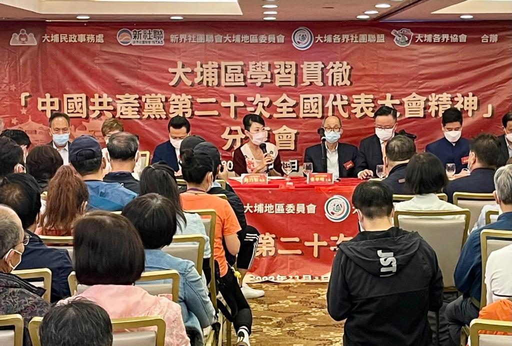 大埔民政事務處今日則聯同大埔各界社團聯盟、新界社團聯會大埔地區委員會及大埔各界協會,在大埔舉辦「大埔區學習『中國共產黨第二十次全國代表大會精神』分享會」。港區全國人大代表、立法會議員、新界社團聯會理事長陳勇,港區全國人大代表陳曉峰及大埔各界聯盟主席張學明為主講嘉賓,他們呼籲地區各界人士在不同崗位上秉持二十大精神,為全面建設社會主義現代化國家出一分力。分享會有超過200人出席,與會者包括區內委員會、鄉事組織、青年團體等代表,以及大埔民政事務處職員。