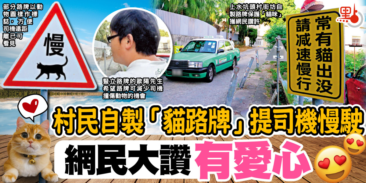 近日有本港的網民在社交媒體分享,在上水和元朗錦上路發現多張有貓圖案,以及提醒司機「常有貓出沒,請減速慢行」的警示路牌,獲網民大讚有愛心,並希望成為正式路牌推廣至其他地方。