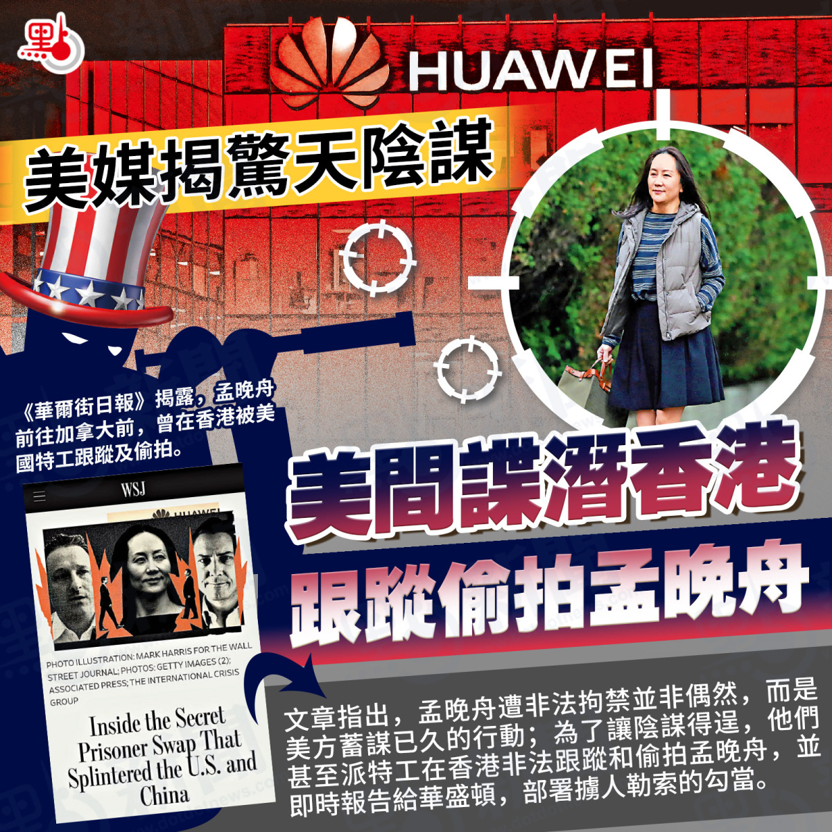 近日美國《華爾街日報》刊登的一篇文章,揭開了事件背後更多不為人知的秘密。文章指出,孟晚舟遭非法拘禁並非偶然,而是美方蓄謀已久的行動;為了讓陰謀得逞,他們甚至派特工在香港非法跟蹤和偷拍孟晚舟,並即時報告給華盛頓,部署擄人勒索的勾當。