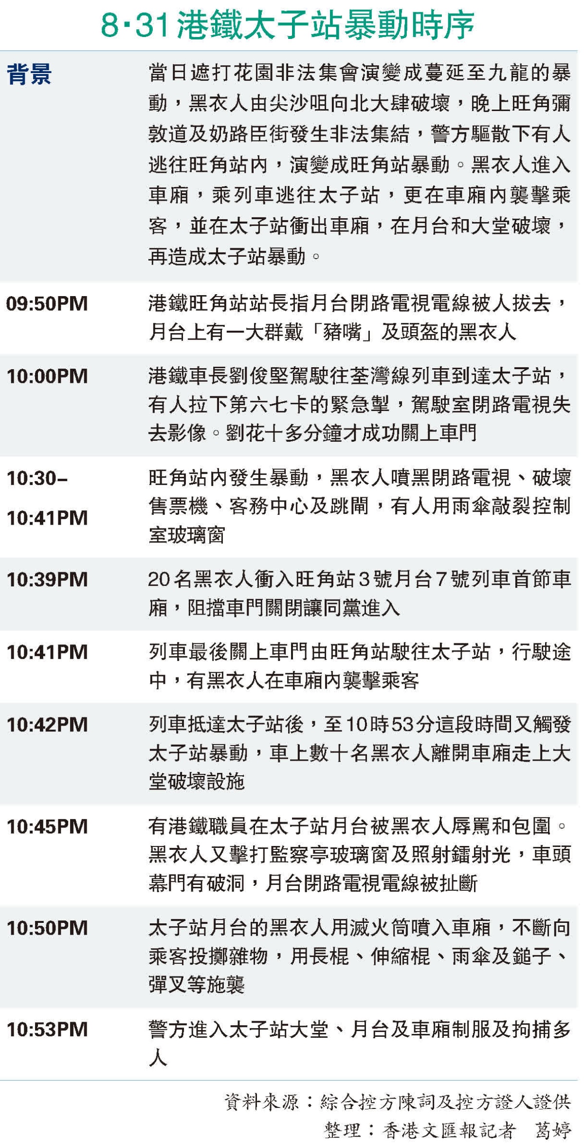 目擊證人X作供表示,他當晚用膳後由尖沙咀乘港鐵到太子站。當時,車上有30名黑衣人和市民爭執,約10名黑衣人下車後在月台指罵車內市民,更向車廂投擲水樽,有人使用滅火筒噴入車廂,有黑衣人揮舞長棍和雨傘衝入車廂欲襲擊乘客,X以雙手抵擋。