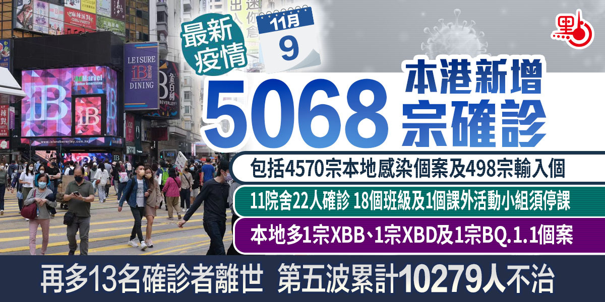 本港第五波疫情持續,衞生署衞生防護中心公布,截至今日(9日)零時,本港過去一日新增5068宗確診個案,包括4570宗本地確診個案及498宗輸入個案。本地確診個案中,核酸檢測陽性個案有1311宗,快測陽性個案3259宗。