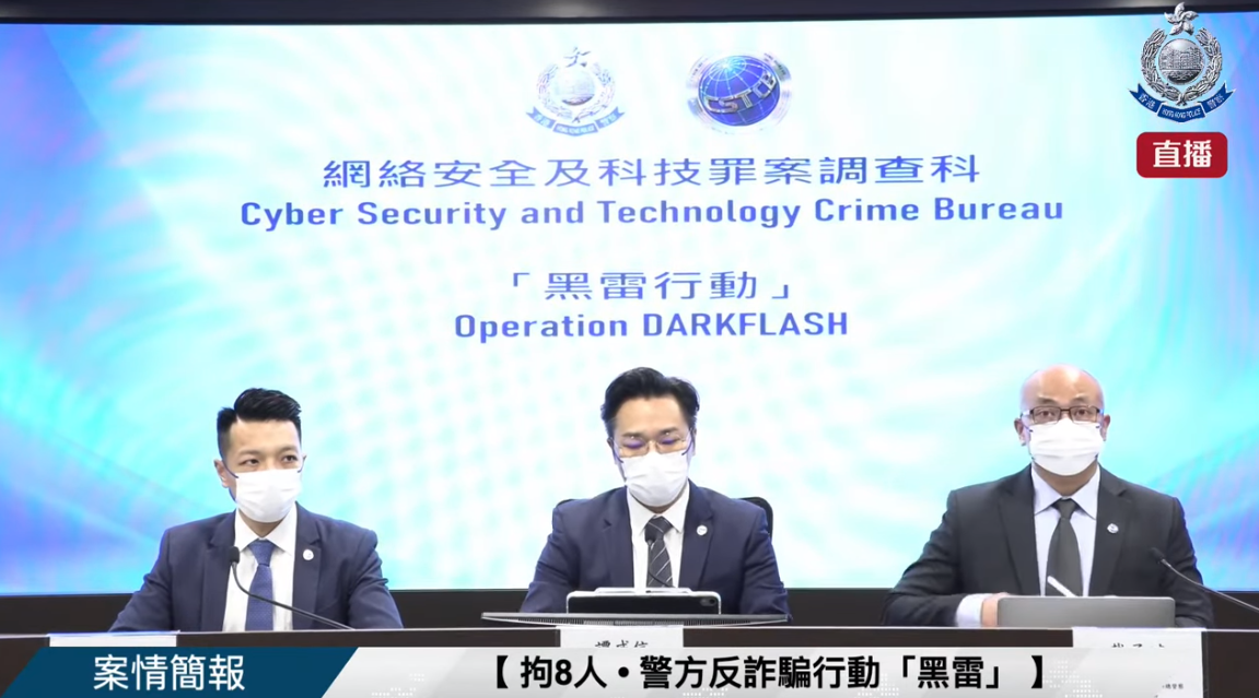 警方於11月7至9日進行「黑雷」反詐騙行動。行動中,警方分別以「串謀欺詐」及「販運危險藥物」罪拘捕8名本地男子,包括詐騙集團主腦及骨幹成員,年齡介乎17至44歲,涉及183宗與「釣魚訊息」有關的騙案,涉案金額超過港幣270萬元。網絡安全及科技罪案調查科警司譚威信、總督察戴子斌及鄧國軒今日(10日)對案情作簡報案情。