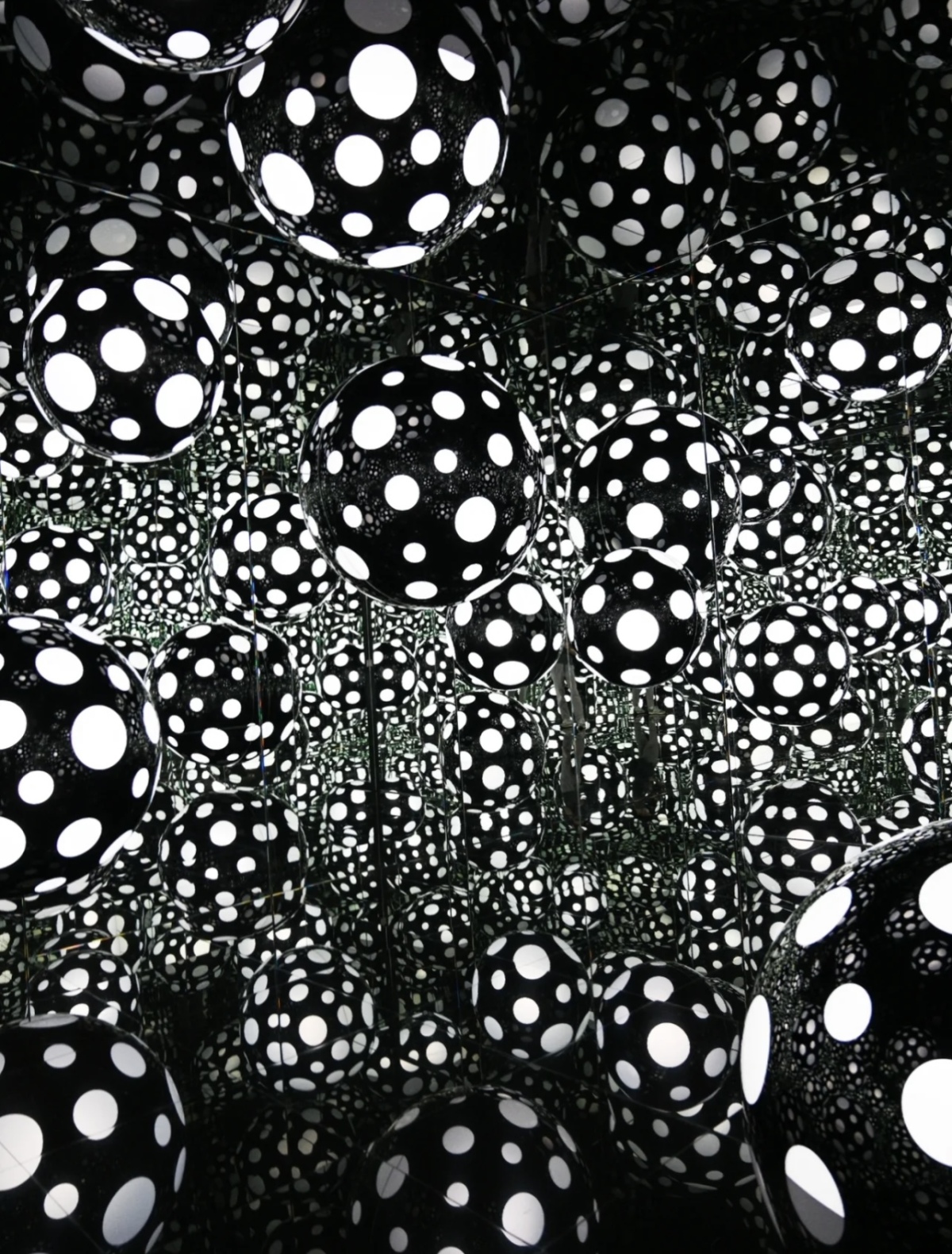 「童年時有一天,我盯着桌布上的紅花圖案看了一會,然後抬頭看天花板,發現整個房間、我的身體和整個宇宙都被紅花圖案覆蓋。我感到靈魂開始消融,在無窮無盡的永恆時間和無垠空間中旋轉不休。」——草間彌生