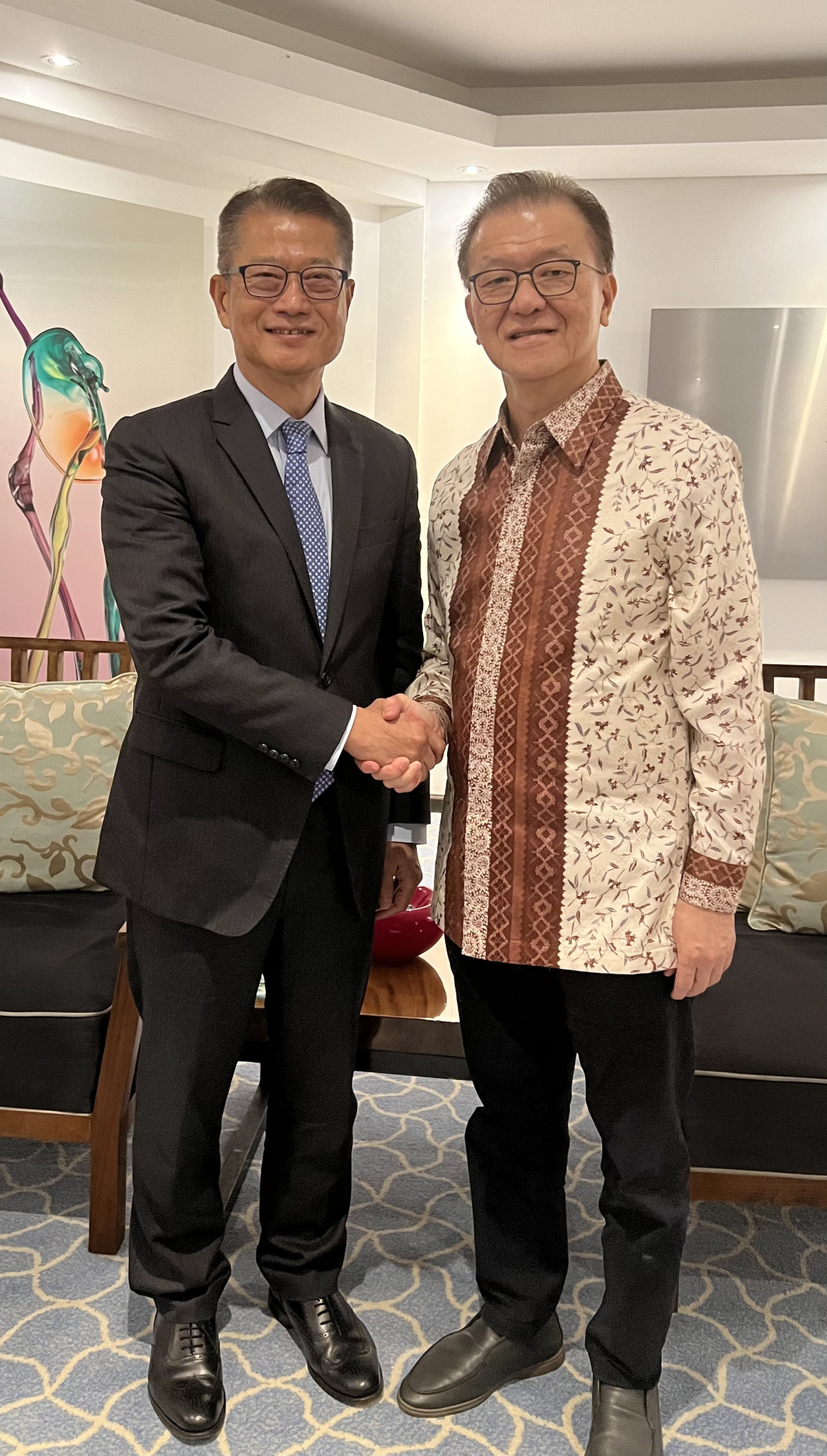 今年峰會以「共同復甦、強勁復甦」為主題,討論全球經濟、能源、糧食安全、公共衞生等議題。出席今日峰會後,陳茂波與Sinar Mas主席及行政總裁Franky Widjaja會面。Sinar Mas是印尼全國最大工商集團之一,業務涉及房地產、金融服務、電訊、能源、基建等。陳茂波向他介紹香港卓越的金融和專業服務,並鼓勵對方利用香港作為平台連繫全球的投資者和資金,並探討各領域的合作機會。