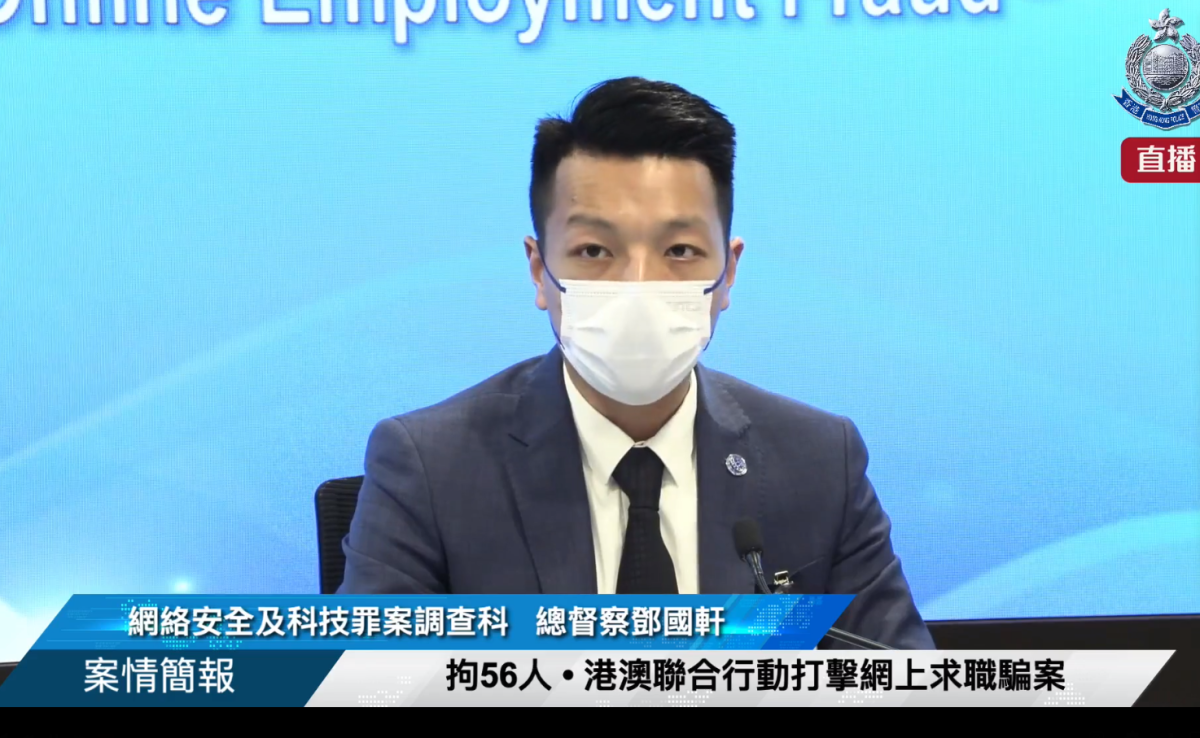香港警方今日(16日)在社交平台上表示,警方東九龍總區、網絡安全及科技罪案調查科,聯同澳門司法警察局於11月9日至15日展開打擊網上求職騙案的「傲陽行動」,成功瓦解一個活躍於兩地的詐騙集團,並以「以欺騙手段取得財產」、「串謀詐騙」及「洗黑錢」等罪拘捕56人包括3名骨幹成員(年齡介乎18至60歲)。被捕人士涉及兩地共131宗求職騙案,損失金額超過700萬港元。
