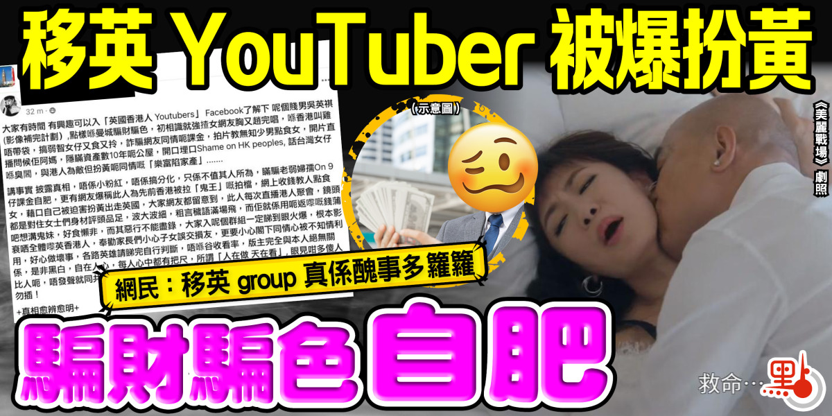 近日移民英國嘅黃絲圈內爆出一宗醜聞,一名叫「吳英祺」嘅YouTuber被爆喺曼城騙財騙色,初相識就強揸女網友胸又「o趙」完唱,詐騙網友同情呃課金自肥。有人仲回帶原來稱此人為先前香港被拉「鬼王」嘅拍檔,網上收錢教人點食女,藉口自己被迫害扮黃出走英國,鬧爆佢影衰全體嚟英香港人喎。