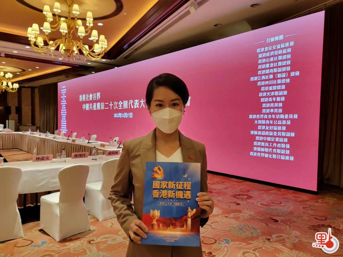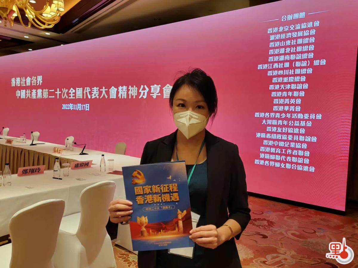 香港菁英會秘書長梁思韻今天以義工的身份出席活動,她表示有幸在分享會中聽到多位重量級人物講解二十大精神,其中駱惠寧主任在會上提及四個關鍵詞,令她印象最為深刻,明白到二十大當中很多香港及「一國兩制」的相關內容,國家為了支持香港發展,推出一系列的優惠政策,港人包括青年人應該把握機會,融入國家發展大局,積極投入大灣區發展。作為教育工作者,她將會帶同今天所學所得,到不同的學校向學生們分享。