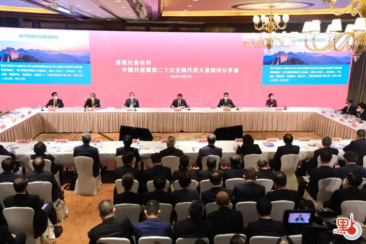 香港40家政團社團今日(17日)聯合主辦「中國共產黨第二十次全國代表大會精神分享會」,香港中聯辦主任駱惠寧應邀出席並作交流分享,介紹二十大主要精神和重大意義,分享新時代十年偉大變革的重大意義和新征程的使命任務,闡述國家發展與香港機遇的深刻關聯,以及創造新偉業所需的團結奮鬥精神。香港社會各界人士表示,未來五年是全面建設社會主義現代化國家開局起步的關鍵時期,在以中國式現代化全面推進中華民族偉大復興的進程中,香港要發揮作用、貢獻力量。