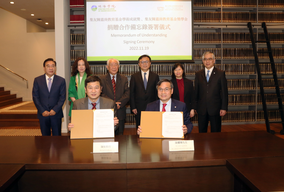 珠海學院聯同集友陳嘉庚教育基金昨日(19日)簽署「集友陳嘉庚教育基金學術成就獎、集友陳嘉庚教育基金獎學金捐贈合作備忘錄」,集友陳嘉庚教育基金將在珠海學院捐資設立「集友陳嘉庚教育基金獎學金」及「集友陳嘉庚教育基金學術成就獎」。集友銀行副總裁兼集友陳嘉庚教育基金副主席陳耀輝與珠海學院校長陳致代表雙方簽署合作備忘錄。
