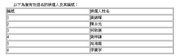 立法會選委會界別補選12月舉行。政府今日(26日)刊憲,公布補選獲有效提名的6名候選人的姓名,以及經抽籤決定,在選票上每名候選人的編號。