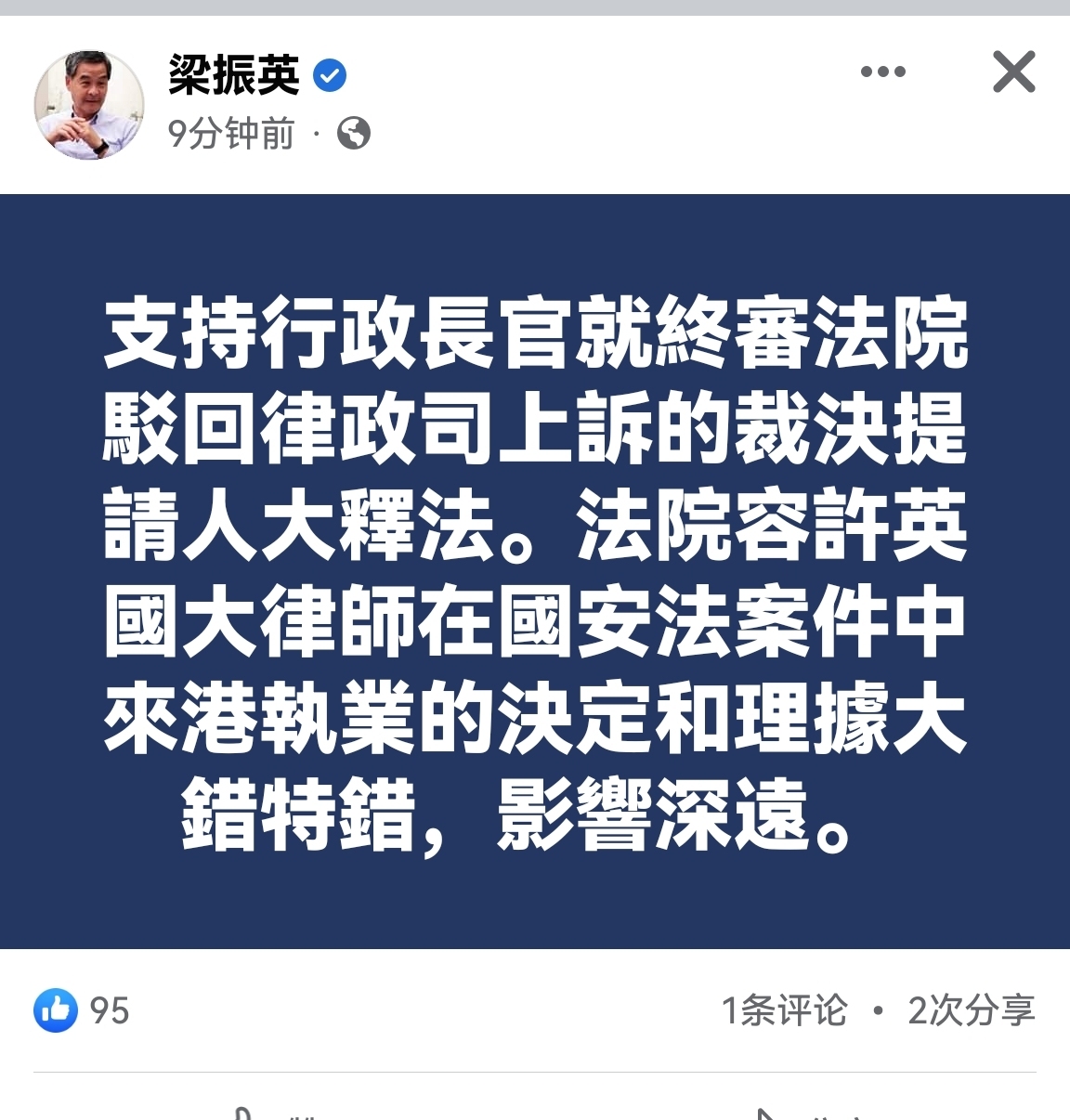 全國政協副主席梁振英隨後在社交平台發文,支持行政長官就終審法院駁回律政司上訴的裁決提請人大釋法。他認為,法院容許英國大律師在香港國安法案件中來港執業的決定和理據大錯特錯,影響深遠。