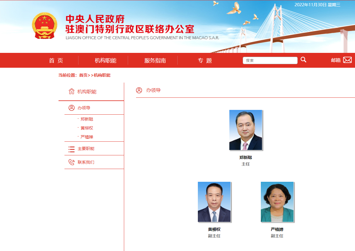 澳門中聯辦網站顯示,澳門中聯辦現時領導架構為「一正二副」,澳門中聯辦主任為鄭新聰,有兩位副主任,分別是黃柳權、嚴植嬋。資料顯示,鄭新聰為二十屆中央委員。