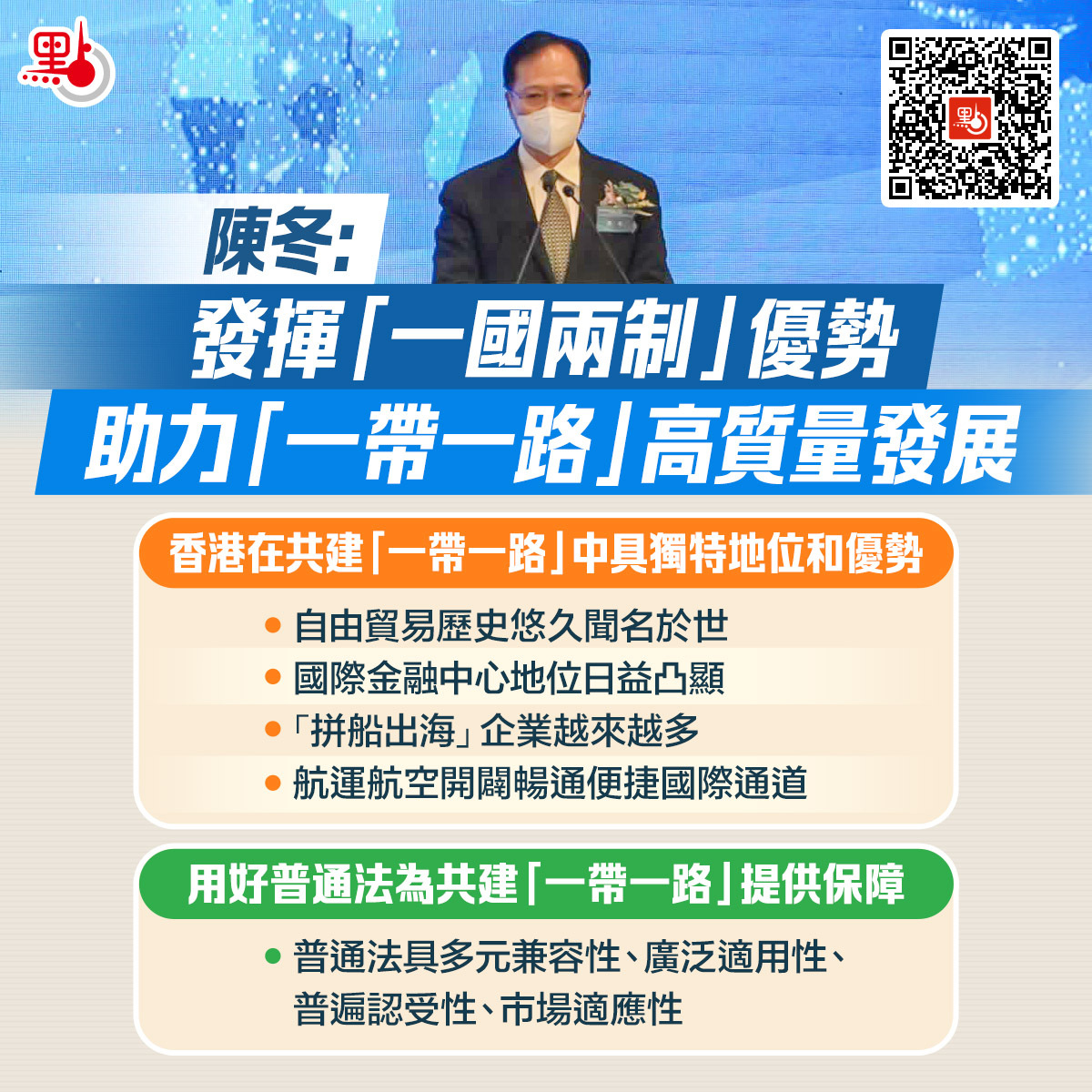 陳冬指出,用好普通法為共建「一帶一路」提供優質法律服務和保障。習近平總書記7月1日在港重要講話兩次提到香港的普通法制度。這充分體現了包括普通法在內的原有法律制度是香港自由開放規範營商環境的重要支撐和保障。