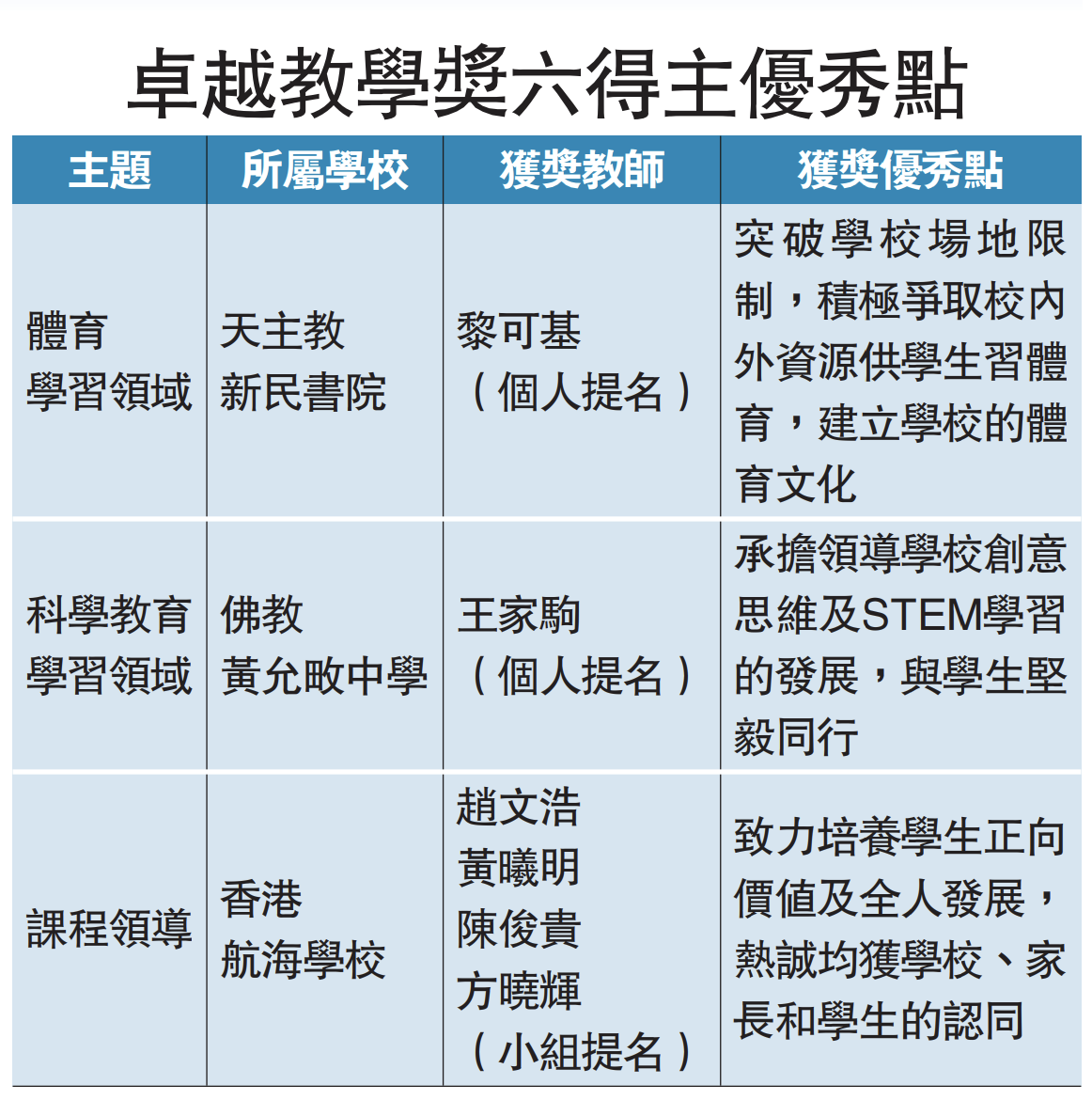 今屆行政長官卓越教學獎分為三個主題,每個主題各有一位或一組得主,「體育學習領域」教學獎得主為天主教新民書院的黎可基老師;「科學教育學習領域」得主為佛教黃允畋中學王家駒老師;「課程領導」得主為香港航海學校的老師小組,包括趙文浩老師、黃曦明老師、陳俊貴老師和方曉輝老師。