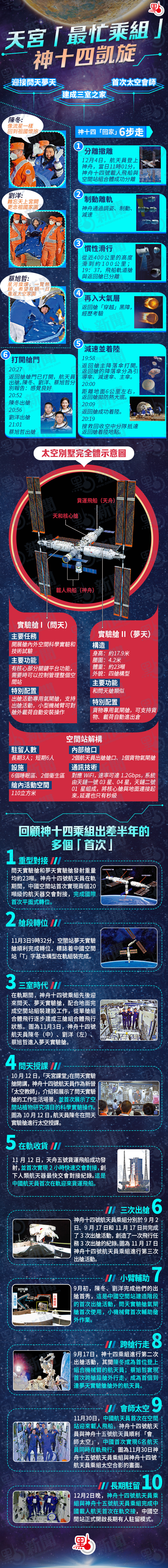 「我們神舟十四號乘組將空間站所有工作交接完畢」,神舟十四號航天員乘組指令長陳冬北京時間12月2日晚將一把大大的空間站鑰匙交給神十五指令長費俊龍。從今年6月5日升空時中國空間站的一居室,到12月4日返回時的三居室「太空豪宅」,神十四乘組與地面配合,迎接問天夢天,完成了空間站T字基本構型組裝建造,進行了首次太空會師。出差半年,神十四乘組都「解鎖」了哪些「首次」?「最忙乘組」稱號是否名不虛傳?快來一圖睇下!