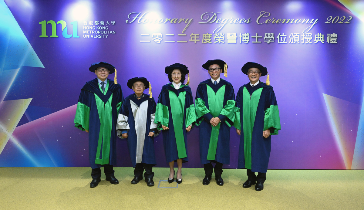 香港都會大學今日(5日)舉行2022年度榮譽博士學位頒授典禮,由校董會主席黃天祥博士工程師頒授榮譽博士學位予五位傑出人士,分別為陳家駒先生、陳一丹博士、舒小佩女士、丁新豹教授及尹錦滔先生,以表揚他們的卓越成就。