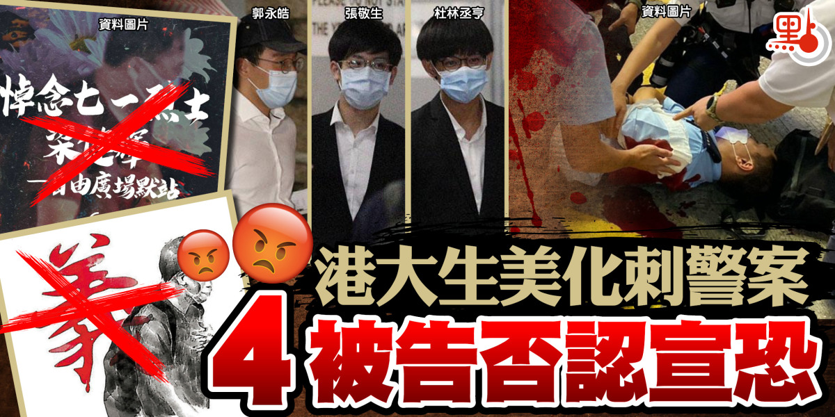 4名被告依次為張敬生(19歲)、郭永皓(20歲)、杜林丞亨(18歲)及容頌禧(19歲)均為學生,被控「宣揚恐怖主義」罪,控罪指他們於2021年7月7日,在香港宣揚恐怖主義。4人另被控一項「煽惑他人有意圖而傷人」作為交替控罪,指4人於同日,在香港非法煽惑他人,意圖使警務人員身體受嚴重傷害,而非法及惡意傷害警務人員。
