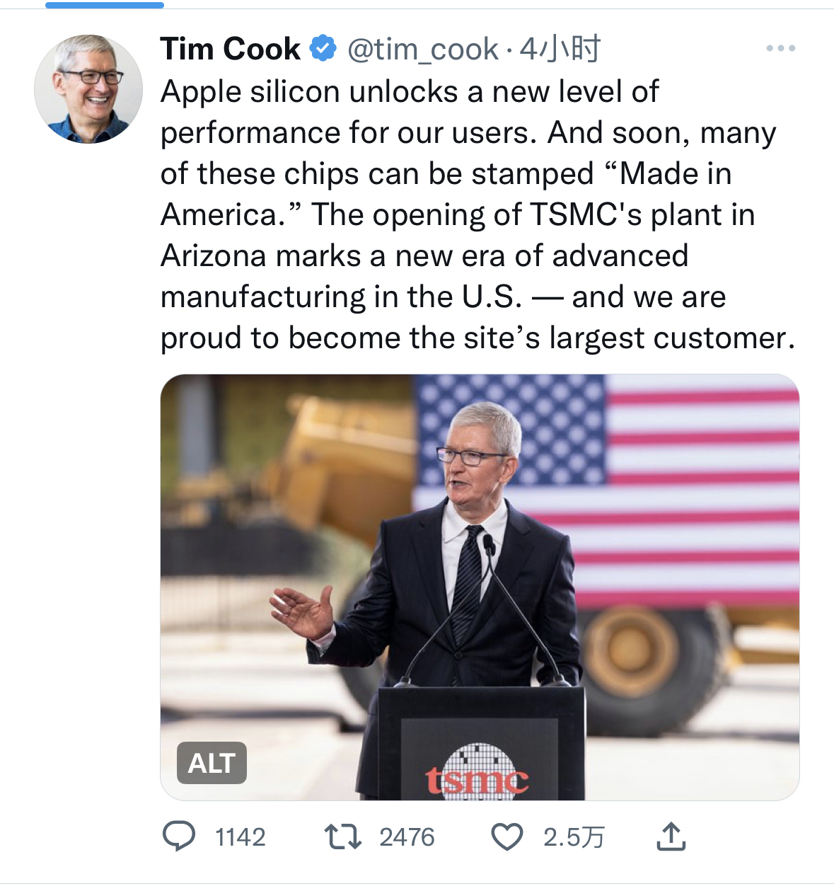 美國總統拜登在演講中提到,目前美國芯片產量僅佔世界總產量百分之十,台積電在美新廠落成對於重塑「美國製造」具有重要意義。拜登同時認為將芯片生產本土化將有利於把相關供應鏈帶回美國。蘋果公司首席執行官庫克也在同日發布推特表示,該芯片工廠解鎖了「美國製造」的新高度,蘋果公司很自豪能夠成為該工廠最大客戶。