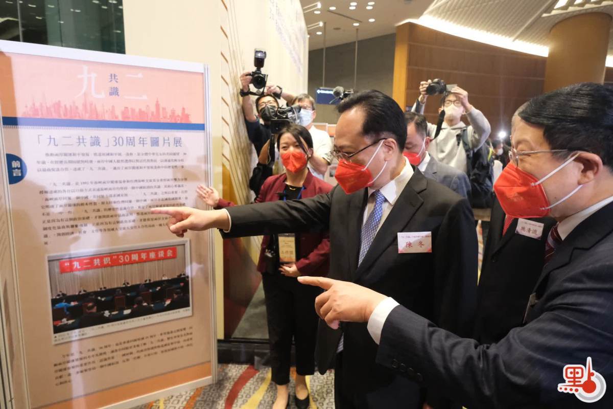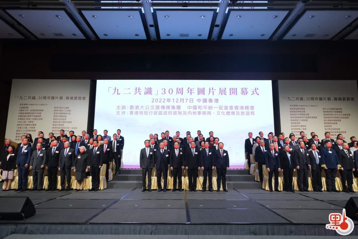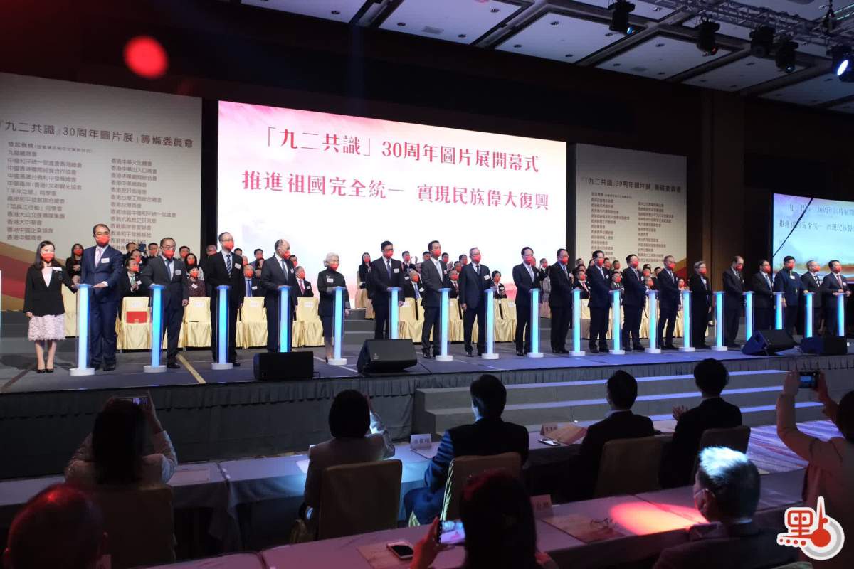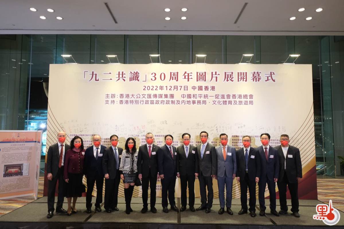今年是「九二共識」30周年,也是香港回歸祖國25周年。香港大公文匯傳媒集團和中國和平統一促進會香港總會於今日(7日)下午在香港會議展覽中心聯合舉辦「九二共識」30周年圖片展開幕式。香港中聯辦副主任陳冬,香港特區政府政務司司長陳國基,籌委會主席、全國政協委員、中國和平統一促進會香港總會會長姚志勝,籌委會主席、香港大公文匯傳媒集團董事長、總編輯兼社長李大宏等出席。全國政協副主席梁振英,中共中央台辦、國務院台辦主任劉結一發表視像致辭。