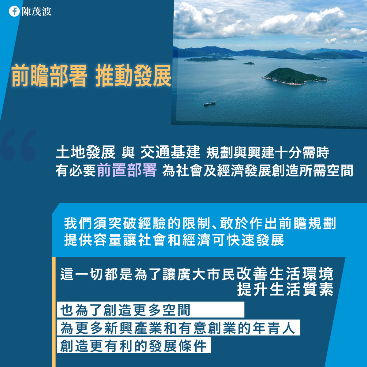 陳茂波指出,按目前規劃,未來十年本港土地供應有兩大主要來源。一是北部都會區,當中約有1300公頃土地估計在未來十年會變為「熟地」;二是交椅洲人工島填海,1000公頃總面積之中的接近三分之一(即300公頃),亦會在未來十年內實現。兩者合共提供1600公頃土地,相等於未來十年、由政府主導的造地項目總供應量的一半。