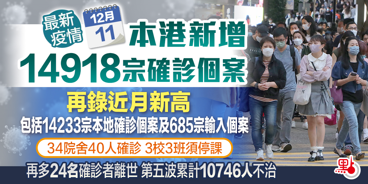 本港第五波疫情持續,衞生署衞生防護中心公布,截至今日(11日)零時,本港過去一日新增14918宗確診個案,繼昨日(10日)新增14377宗確診個案後,再錄近月新高。新增確診個案包括14233宗本地確診個案及685宗輸入個案。本地確診個案中,核酸檢測陽性個案有2950宗,快測陽性個案11283宗。
