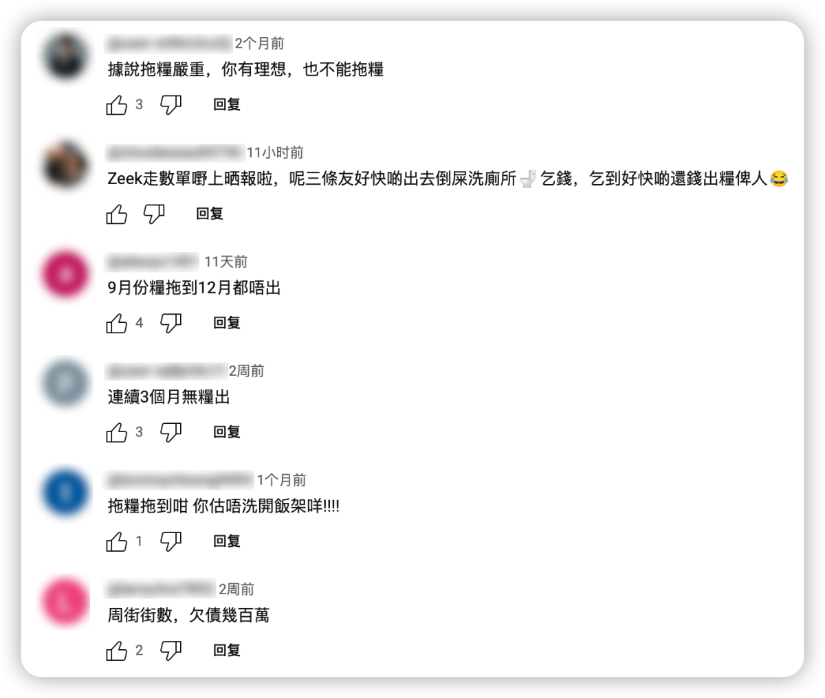 記者在查詢Zeek相關信息時發現,由於Zeek平台大量欠薪,以致在Youtube關於Zeek的宣傳視頻下,只剩下一片討薪的聲音。評論如「你有理想,也不能拖糧」,「希望員工拎返欠薪」等已算「友好」,更多情緒激動者寫出的評論就更激動。由此觀之,Zeek欠薪的行為波及人數不少,影響頗大。