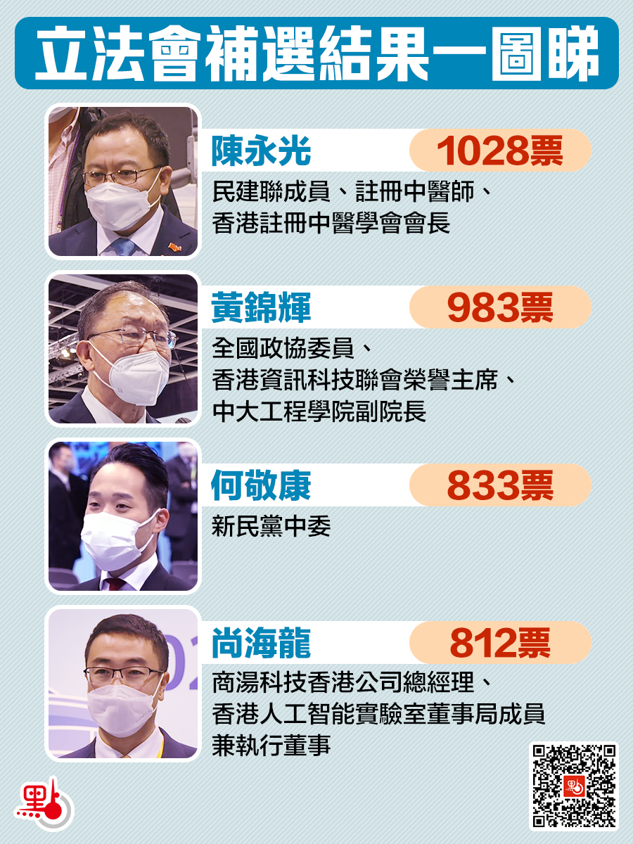 選舉管理委員會主席陸啟康法官公布選舉結果,陳永光得票1028票,成為最高得票者;其次是黃錦輝983票,第三名何敬康833票,第四名尚海龍812票。四人於補選中成功當選,黃梓謙及李廣宇則以791票及781票雙雙落敗。