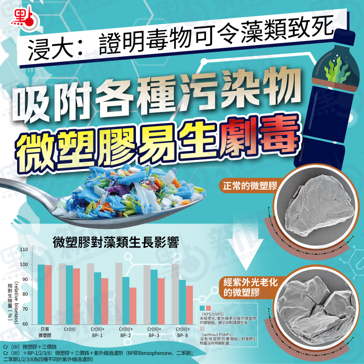 據今年3月的英國《衛報》報道,科學家首次在人體血液中檢測到微塑膠;同年4月,科學家首次在人體肺部發現微塑膠,反映微塑膠對人類健康的威脅已經愈來愈大。然而,另一方面,微塑膠帶來的確切危害,即使在學界仍處於一知半解階段。有本港科研團隊經過多次實驗研究,亦首次證明了各種環境污染物會在微塑膠表面上並存,形成毒性強烈的複合物。