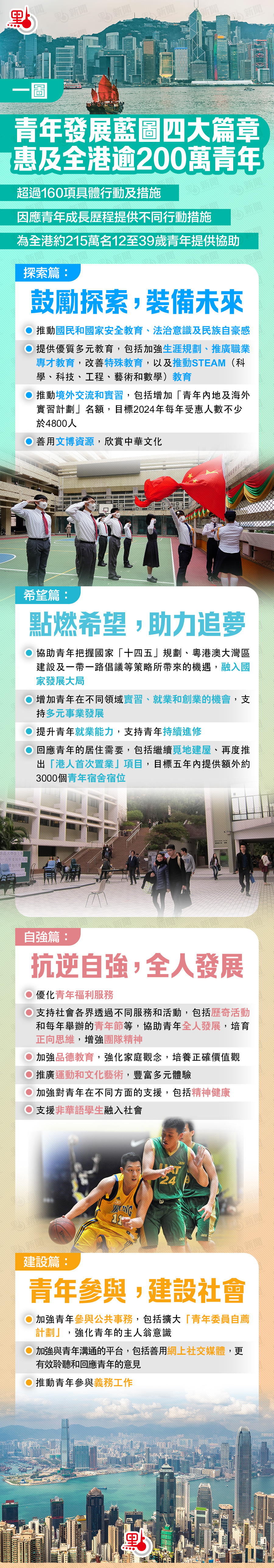 因應青年的成長歷程,藍圖分為《探索篇》《希望篇》《自強篇》及《建設篇》四個篇章闡述政府工作方向,點新聞整理四大篇章下的主要行動措施,睇下邊啲同你關係密切?
