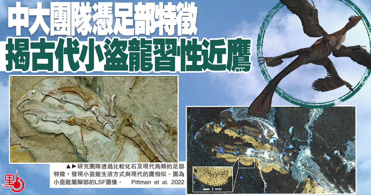 現代鳥類的腳掌形狀多樣,能反映出鳥類棲息位置、捕獵等不同生活習性。中大及國際古生物學家組成的研究團隊通過比較化石及現代鳥類的足部特徵,包括趾墊、腳部的鱗片、爪及關節,發現小盜龍是白堊紀鳥類的飛行近親,其生活方式與現代的鷹相似。