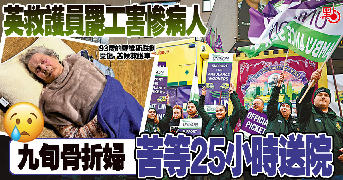 英國多達一萬名救護車人員昨日發起大罷工,導致大量救護車停擺,服務嚴重受影響。而在罷工前,威爾斯一名93歲老婦在院舍跌倒,足足等了25小時才有救護車到來,老婦期間躺在地上痛苦叫喊。她在送院檢查後被發現盆骨骨裂,家人狠批事件不可接受。