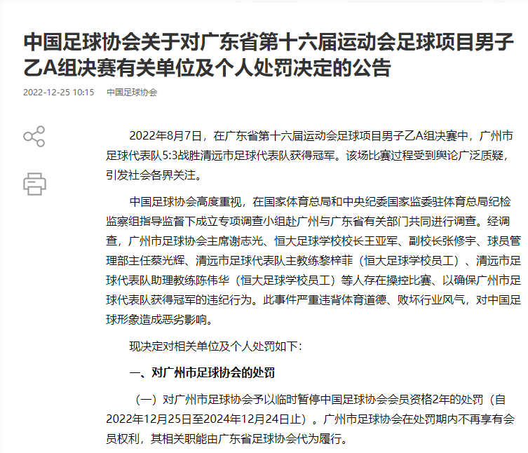 中國足協表示,對廣州市足球協會予以臨時暫停中國足球協會會員資格2年的處罰(自2022年12月25日至2024年12月24日止)。廣州市足球協會在處罰期內不再享有會員權利,其相關職能由廣東省足球協會代為履行;對清遠市足球代表隊和恒大足球學校提出通報批評;對廣東省足協提出通報批評,並責令其作出深刻檢查。