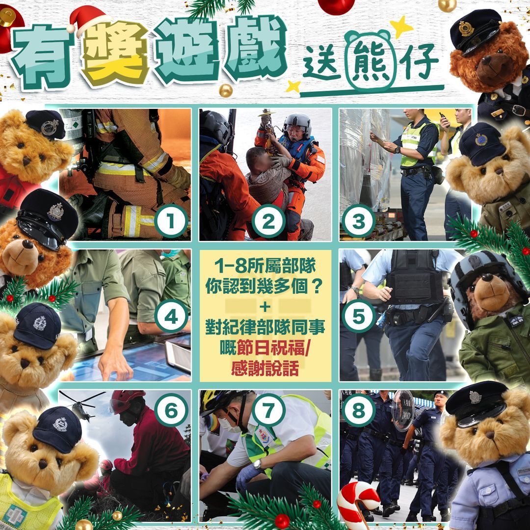 適逢聖誕節,保安局大玩遊戲並派聖誕好禮。保安局Facebook專頁今日(25日)上載圖片,圖中有8個部隊人員身穿制服的工作相。帖文指,最快估中圖中8個制服部隊所屬紀律部隊的30名市民,加上留言對紀律部隊同事的節日祝福或感謝,即可獲得精美紀念品。當中猜中且祝福留言最有創意的3名市民,更可得到紀律部隊熊仔,款式隨機送出。