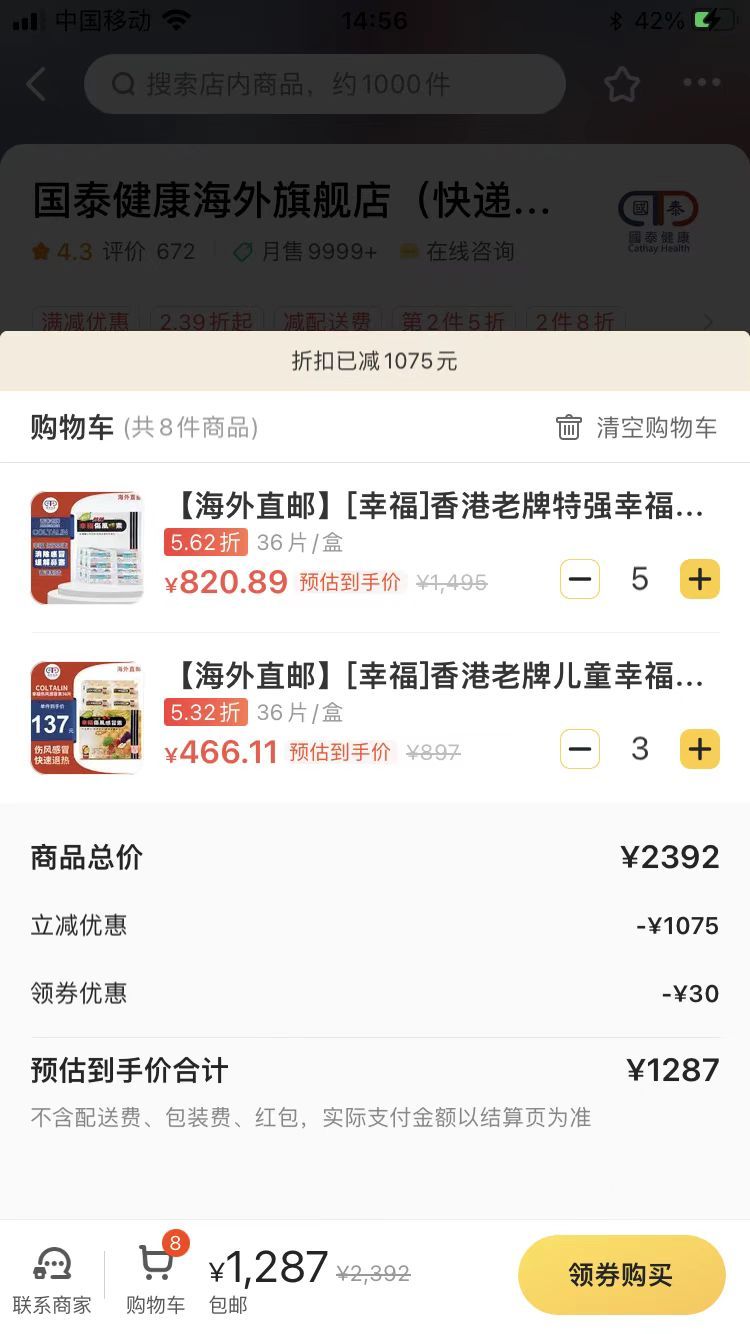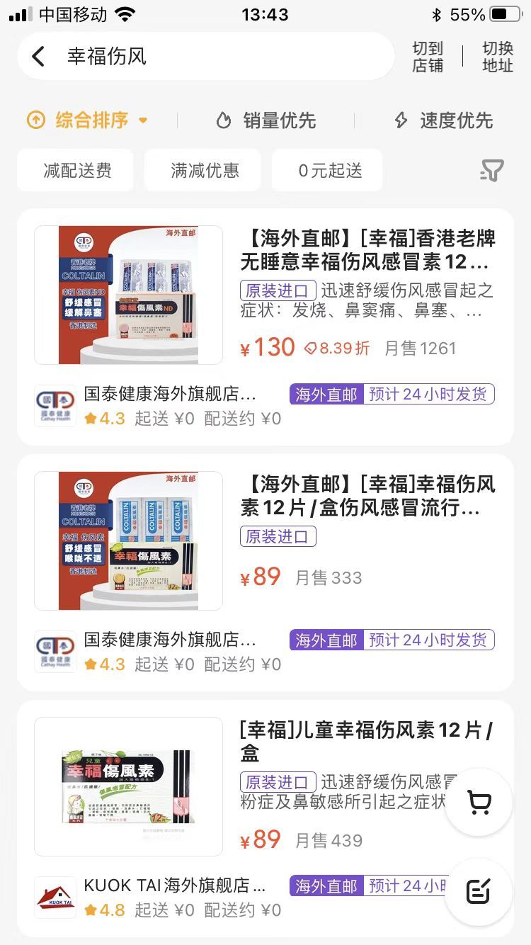 有內地網民先行一步,未及開關先從網上訂購。有網民從網上訂購幸福傷風素寄回內地,驚覺價格翻番。成人5盒、兒童3盒用量預估到手價1287元人民幣(約1440元港幣),從香港發貨至內地需7至10日。