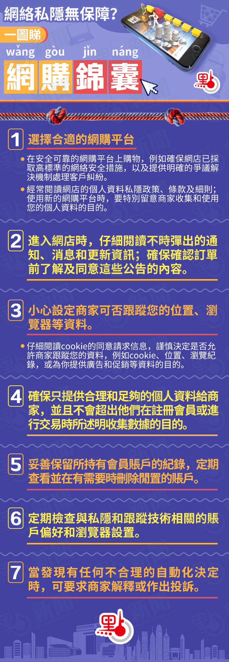 隨着科技進步,人工智能(AI)近年發展迅速,特別是在電子商務的應用方面,為消費者帶來便捷及個人化的購物體驗,不過,我們在網上留下的「足跡」,令我們的喜好、需求、經濟狀況等一覽無遺。我們看到的資訊、推薦,都可能是商家為我們「量身定製」,影響我們的購物決定,甚至可能損害消費權益。對此,點新聞特別製作了網購錦囊,提醒消費者在進行網購的同時學會如何防止個人隱私洩露。現來一圖睇清!