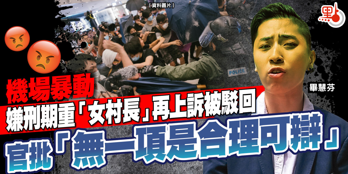有「佔旺女村長」之稱的黑暴分子畢慧芬,在2019年香港國際機場暴動案中參與禁錮和襲擊內地記者付國豪,被裁定暴動、非法禁錮和襲擊罪成,判囚4年3個月。她早前就定罪和刑期第二度提出上訴,提出多個所謂理據,否認其所犯罪行及嫌刑期「太重」。上訴庭昨日公布判決理由,裁定畢慧芬的上訴理由「沒有一項是合理可辯,故駁回她的上訴」,維持本案的定罪與判刑。