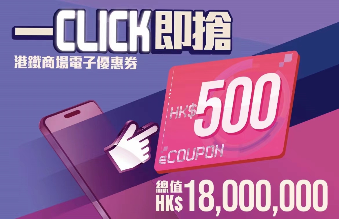 港鐵商場推出「一Click即搶」活動,今日(29日)中午12時起,MTR Mobile登記用戶只需要登入MTR Mobile,即有機會搶走500元港鐵商場指定類別電子優惠券(名額3萬份)、500元港鐵商場時裝電子優惠券(名額3000份),以及500元港鐵商場指定美容品牌商戶電子優惠券(名額3000份)。