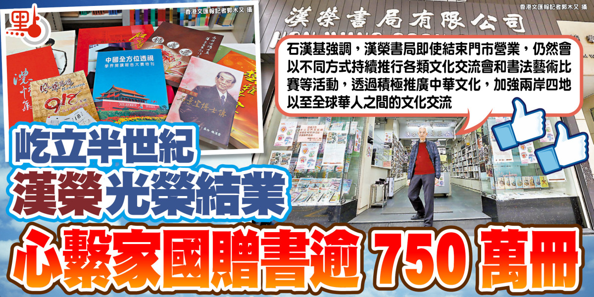 漢榮書局創始人石景宜曾以「少年讀書,中年賣書,老年送書」來概括自己與書的緣分,同時體現出這位愛書之人心中有着熾熱的家國情懷。石漢基表示,自1978年內地改革開放起,父親多次回內地考察,發現內地院校和圖書館對各類圖書非常渴求,故毅然將圖書零售的收益全數用作購買內地所需圖書,回饋國家、回饋社會。石家先後向全國30多個省市自治區的大學圖書館、公共圖書館及科研機構等數百個單位,無償贈書超過750萬冊,又多次在海峽兩地舉辦兩岸當代名家書畫展,以及出版數十套大型書畫集免費贈送予各地的藝術家及藝術團體,為文化藝術交流作出貢獻。