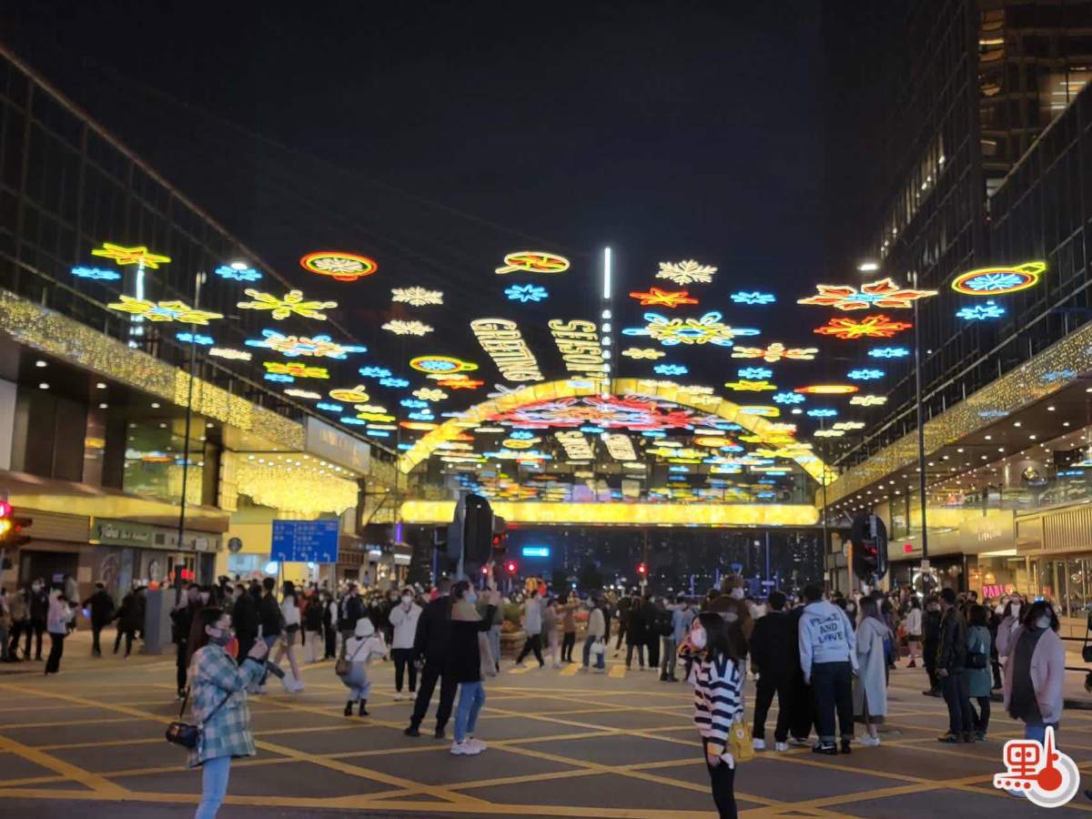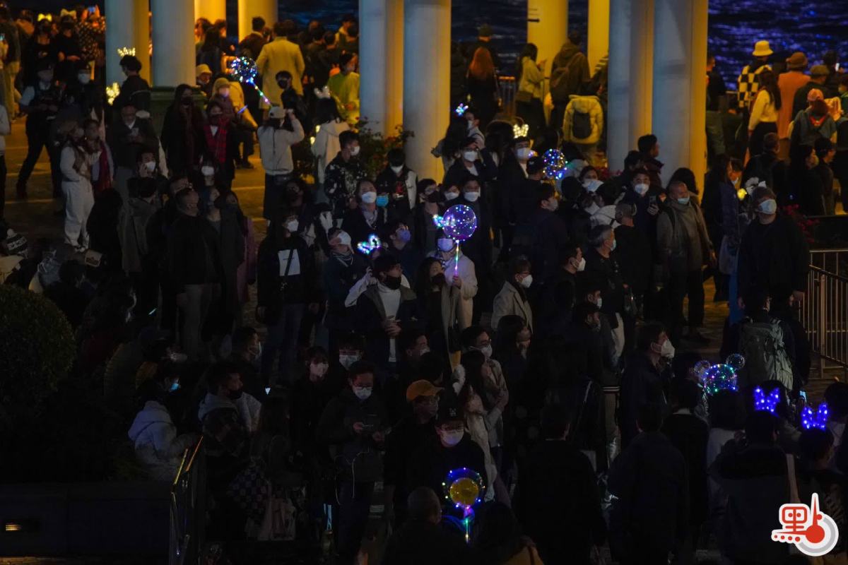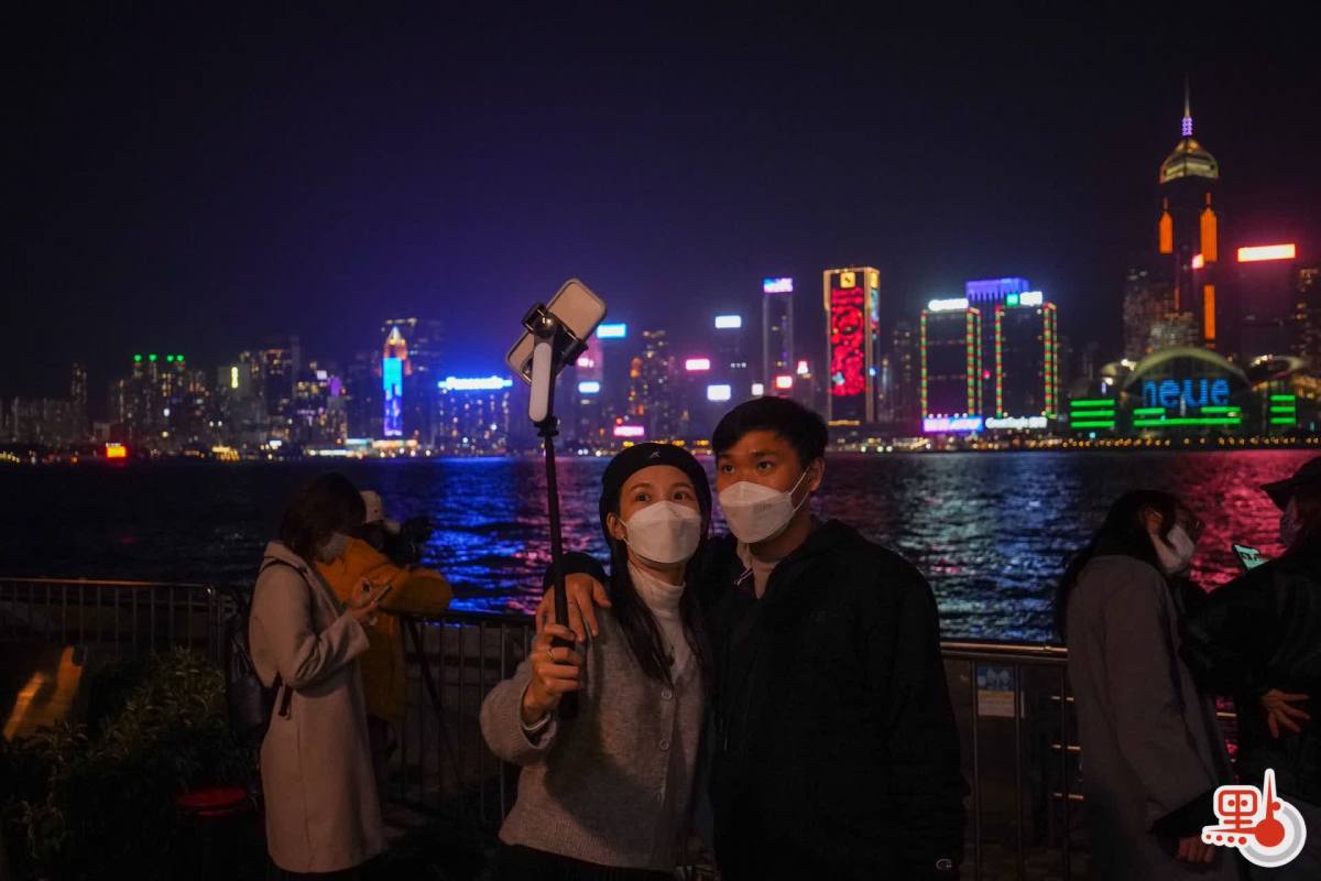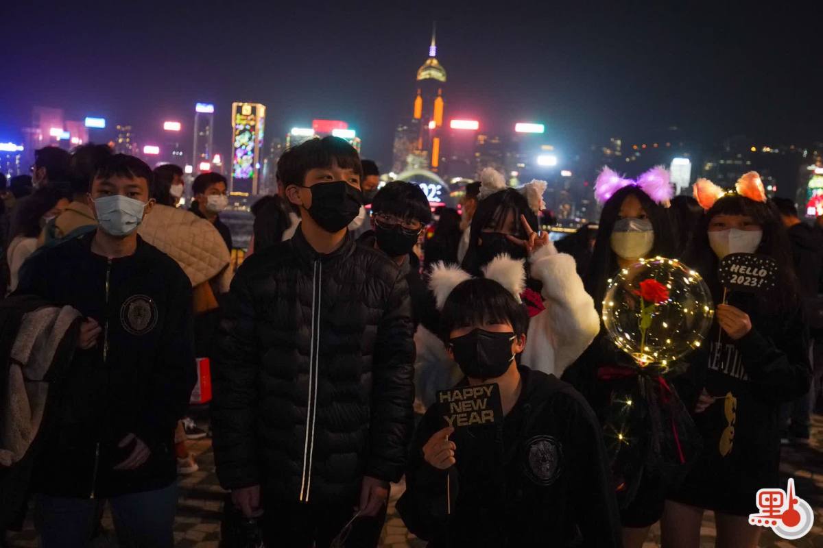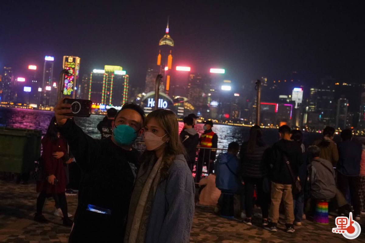在尖沙咀,海傍一帶入夜後人流愈來愈多,不少市民在燈飾前拍照留念,亦有市民戴閃燈飾物充滿氣氛,天星碼頭有近百人觀賞街頭雜耍表演。有市民表示,今年的跨年氣氛較去年好很多,市面人流更旺,認為香港即將復甦,希望來年香港市民不用再戴口罩。
