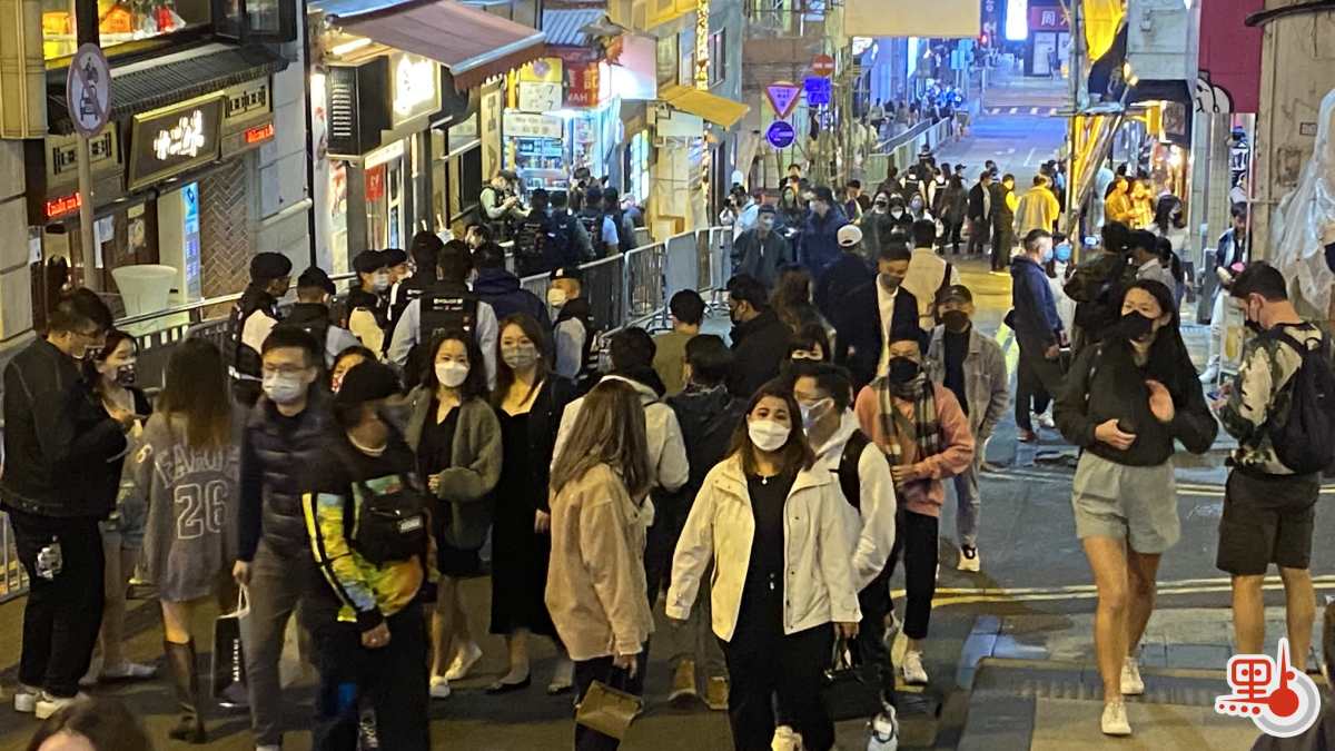在中環蘭桂坊,酒吧傍晚時陸續營業,不少市民前來打卡。入夜後人流增多,氣氛十足,現場亦有警員維持秩序。