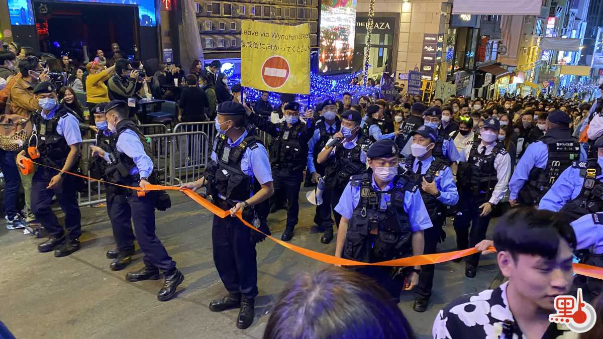 警方晚上在蘭桂坊實施人潮管制。(點新聞記者任青攝)