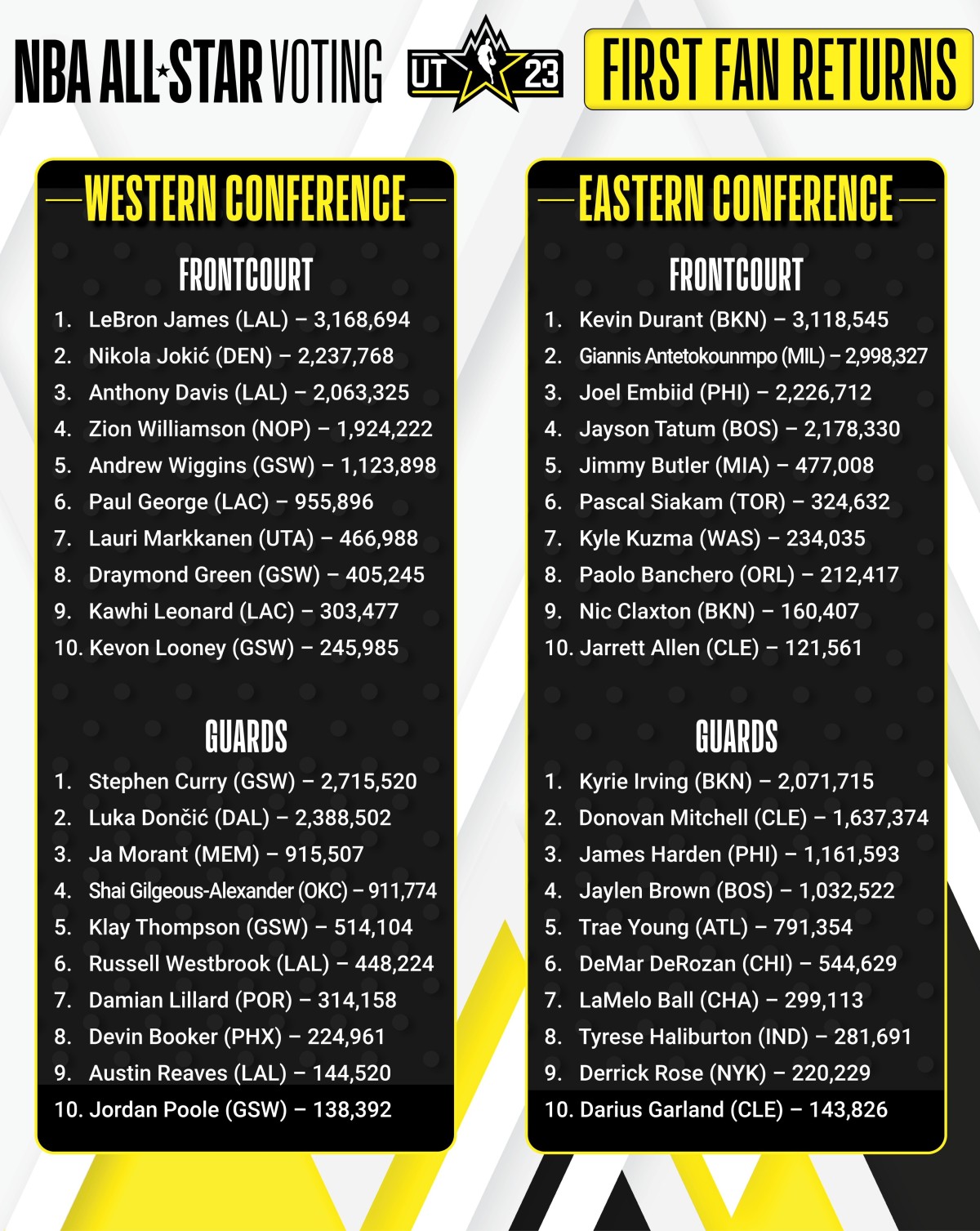 美國職業男籃(NBA)2023年全明星賽將於下月展開,近日進行全明星陣容投票,第一階段投票已經於星期四(5日)結束,洛杉磯湖人隊的勒邦占士(LeBron James)及布魯克林籃網的杜倫(Kevin Durant)分別領跑東西部,其中勒邦占士以逾5萬票的優勢成為全聯盟「票王」。倘若二人能夠將優勢保持到最後,將會是二人連續3年成為東西兩岸的隊長。
