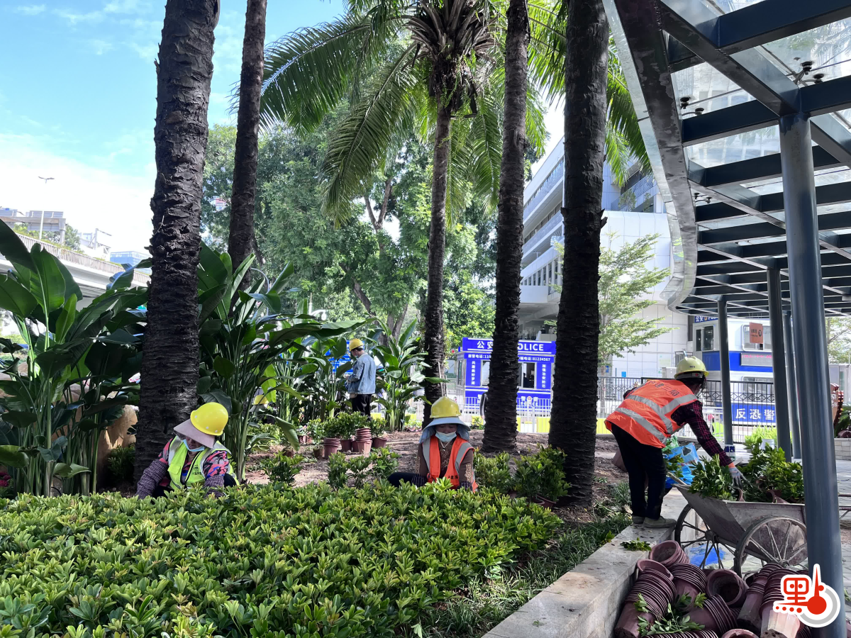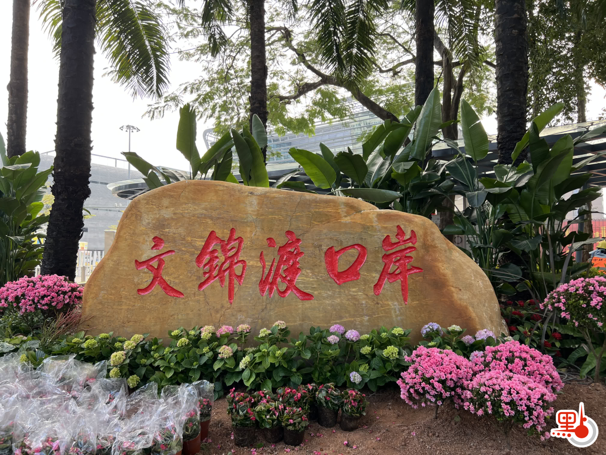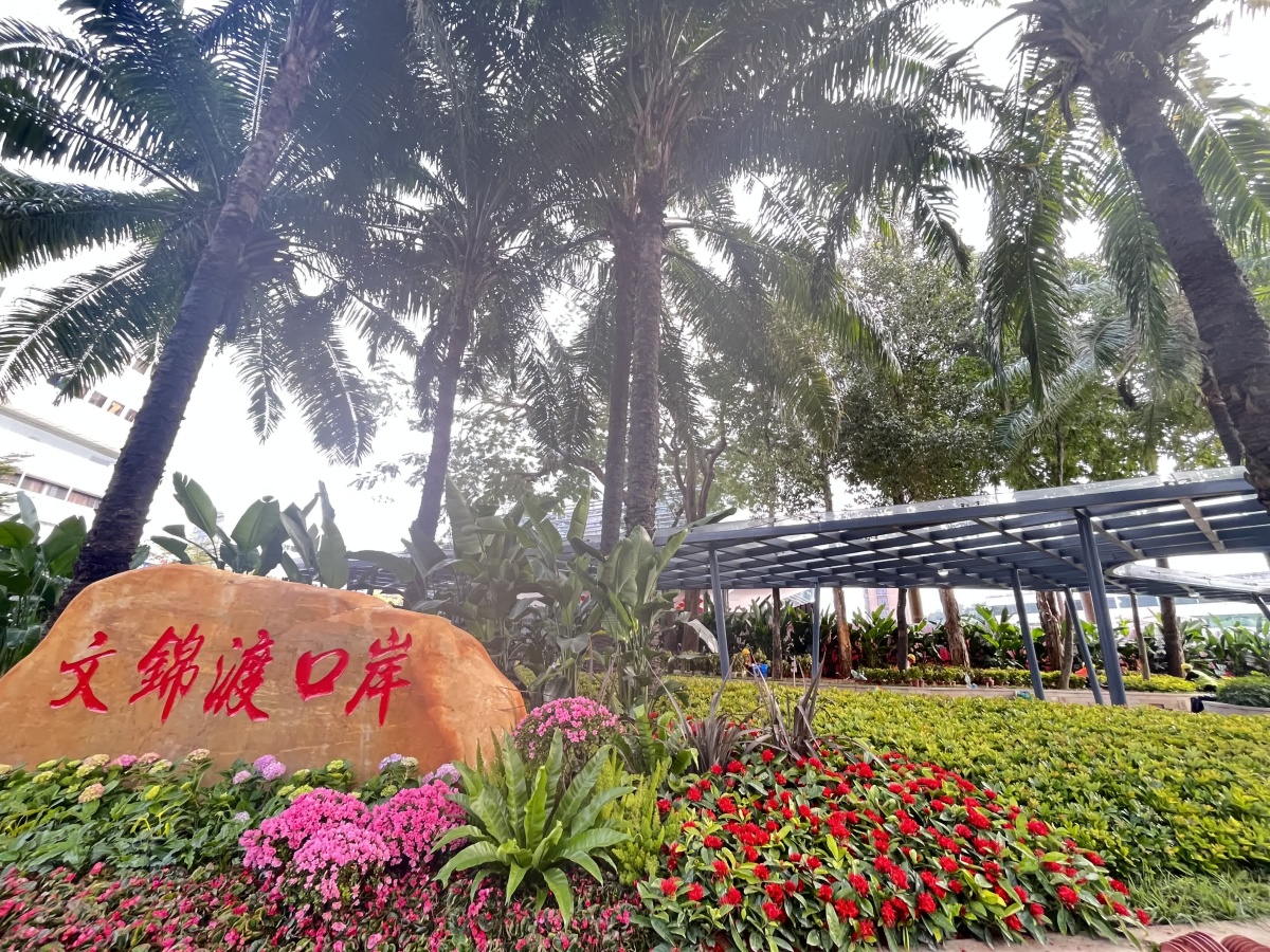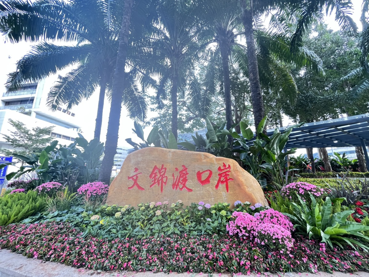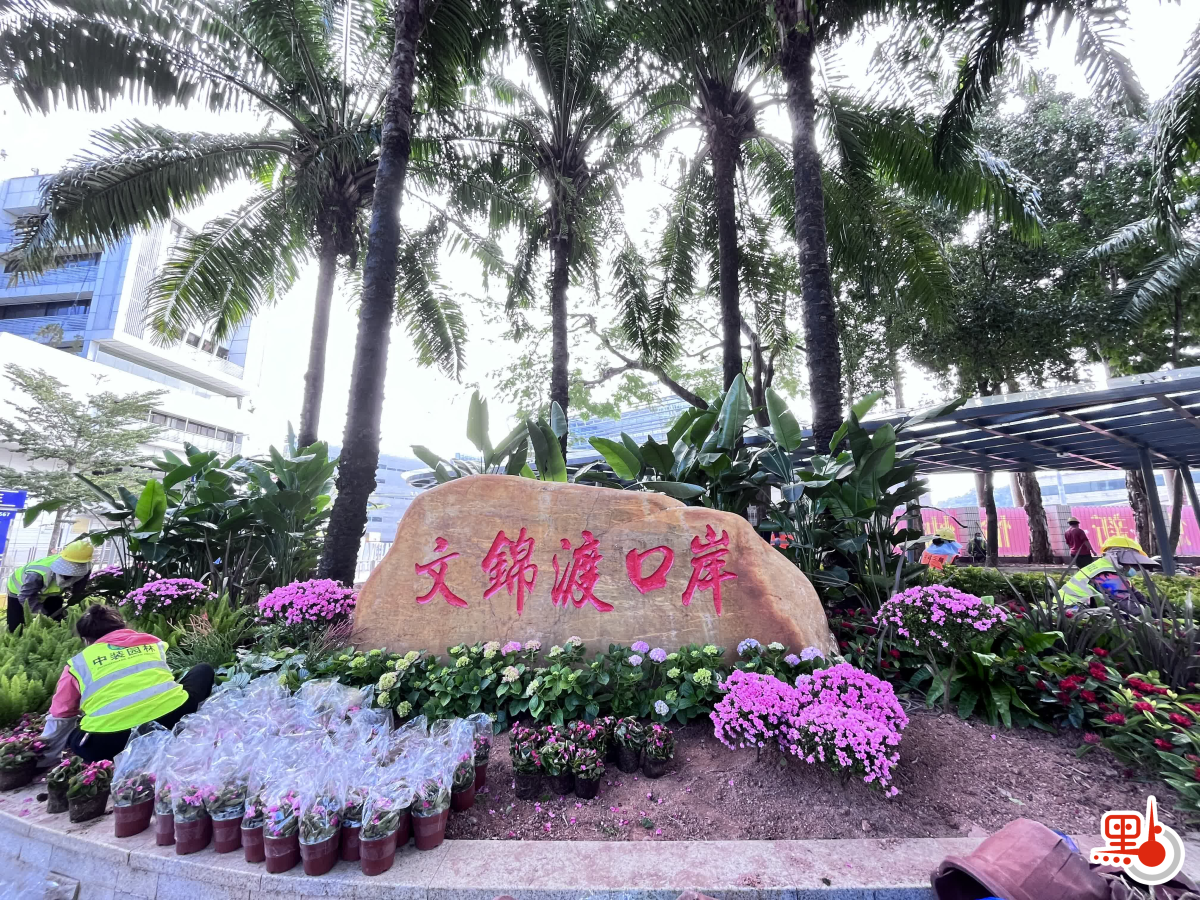 出入口外圍,廊架翻修一新,原有地被綠化已全部清理,種植上了新的花徑、地被,「文錦渡口岸」標識也已重新補油漆翻新。現場協調負責人蔡先生介紹,油漆翻新施工團隊連夜趕工,外圍油漆已全部翻新,計劃下午二時左右完成,植被綠化更新預計下午4時完成。